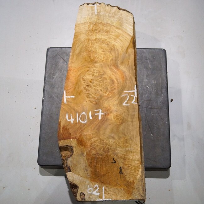 Amboina Maserplatte, gefräst, ca. 620 x 220 x 45 mm, 41017, 4,3 kg, luftgetrocknet, Einschnitt 11.2023.