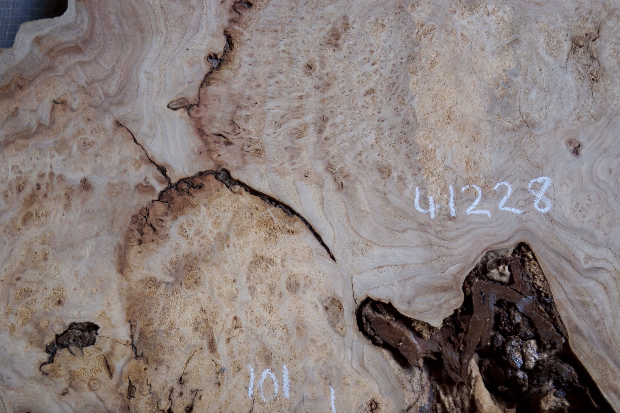Kaukasische Rüster Maser, gefräst, ca. 1020/1010 x 650 x 60 mm, 41228, ca. 33 kg, luftgetrocknet, lange abgelagert, Risse, Äste, Borkeneinwüchse, Faulstellen. Sie erhalten das abgebildete Einzelstück!