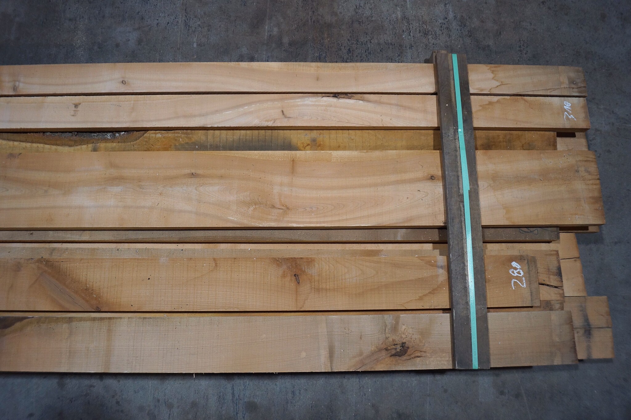 B Qualität, Kirschbaum Schnittware, 35 mm Stärke, Paketmaß ca. 3100 x 1000 x 150 mm, künstlich getrocknet. Insektenfraß, Risse, Äste möglich.