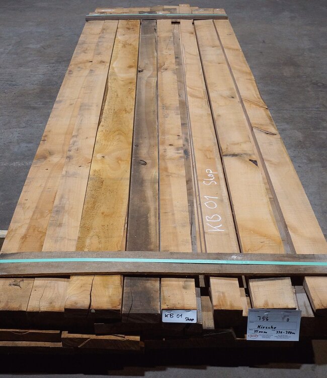 B Qualität, Kirschbaum Schnittware, 35 mm Stärke, Paketmaß ca. 3800 x 1050 x 150 mm, künstlich getrocknet. Insektenfraß, Risse, Äste möglich.