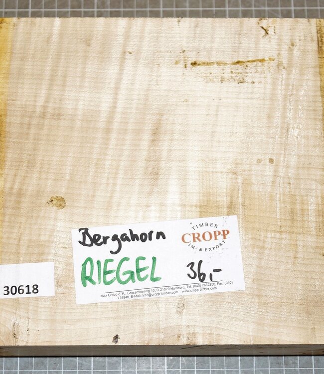 Bergahorn, Riegel, ca. 220 x 220 x 60 mm, 2,08 kg, künstlich getrocknet. Sie erhalten das abgebildete Einzelstück.