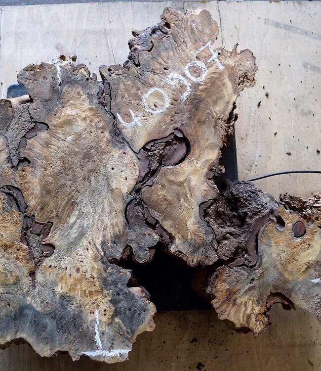 Buckeye Maser, ca. 580 x 470 x 52mm, 4,4kg, künstlich getrocknet, Borkeneinwüchse, Lehmeinschlüsse. Sie erhalten das abgebildete Einzelstück!