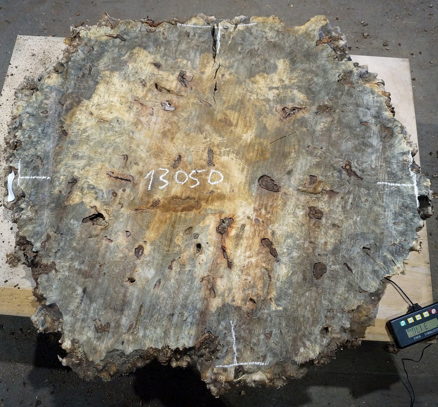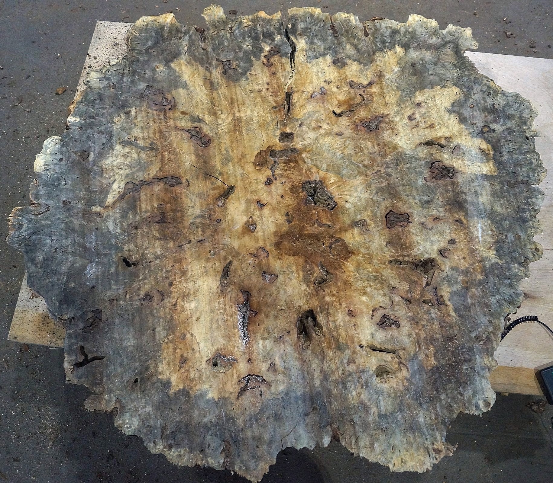 Buckeye Maser Tischplatte, ca. 1240(1400) x 1115(1300) x 60 mm, 13050, ca. 31,7 kg, Risse, künstlich getrocknet, Borkeneinwüchse und Lehmeinschlüsse möglich.