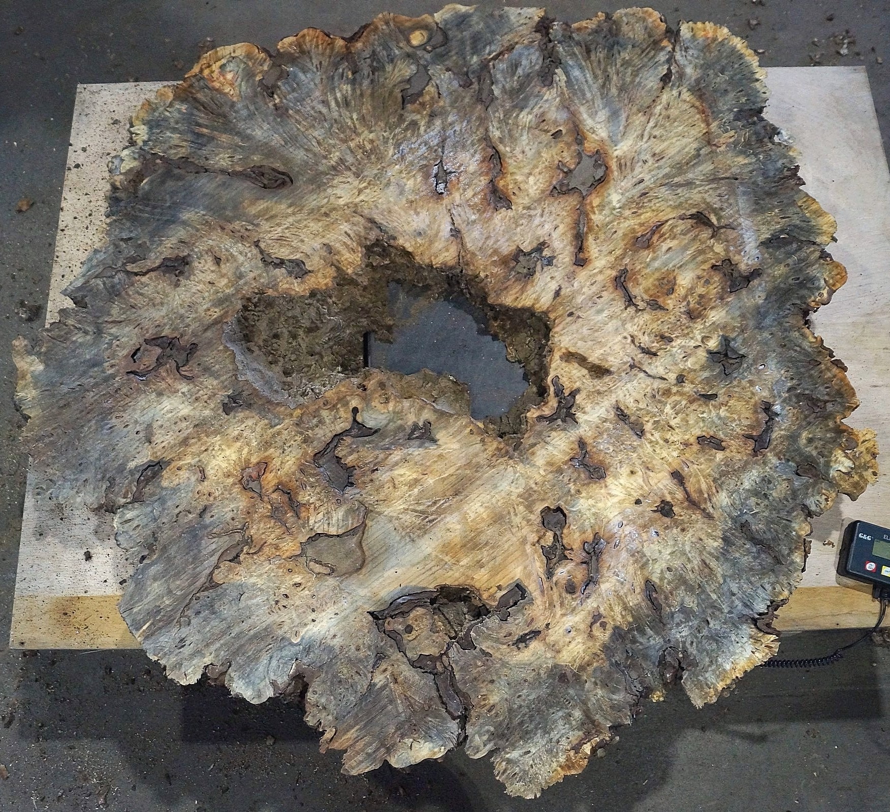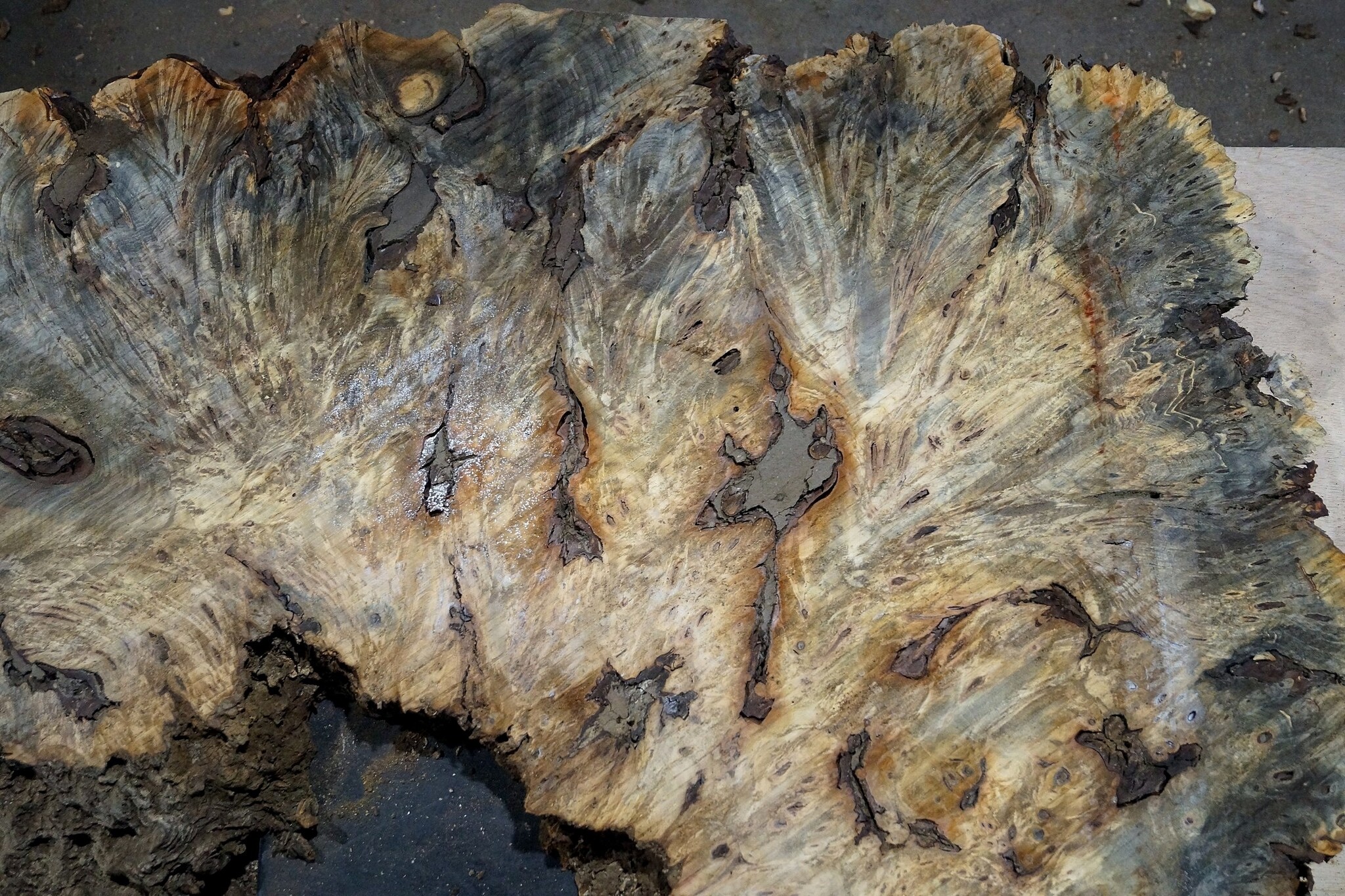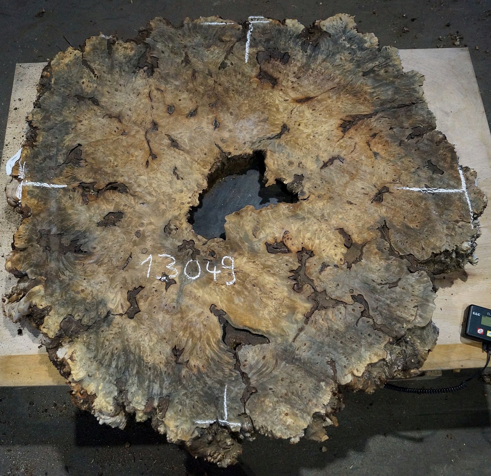 Buckeye Maser Tischplatte, ca. 1200(1310) x 1110(1130) x 52 mm, 13049, ca. 34,4 kg, künstlich getrocknet, Borkeneinwüchse und Lehmeinschlüsse möglich.