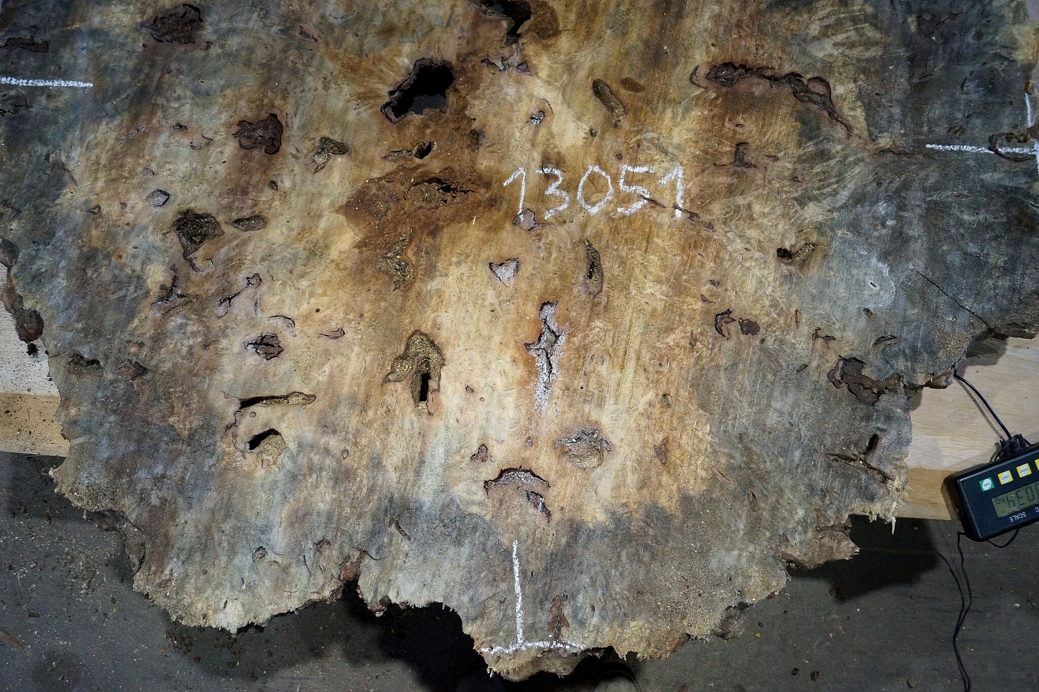 Buckeye Maser Tischplatte, ca. 1330(1420) x 1260(1330) x 52 mm, 13051, ca. 30,3 kg, Faulstelle, künstlich getrocknet, Borkeneinwüchse und Lehmeinschlüsse möglich.