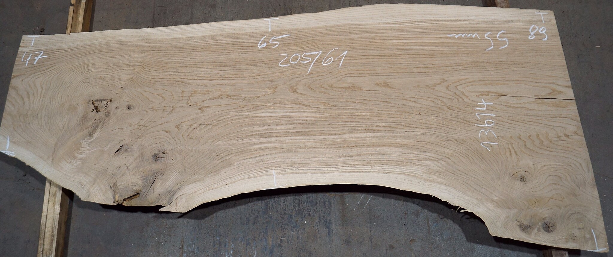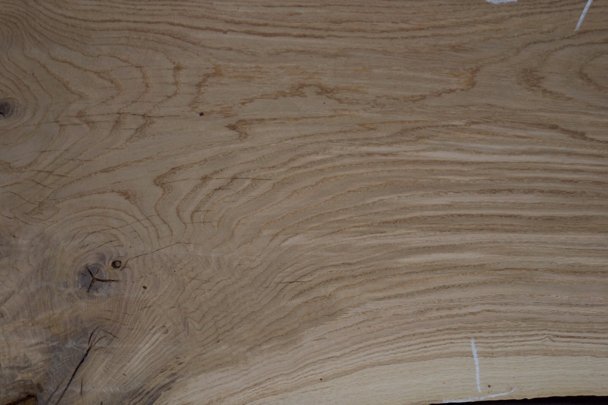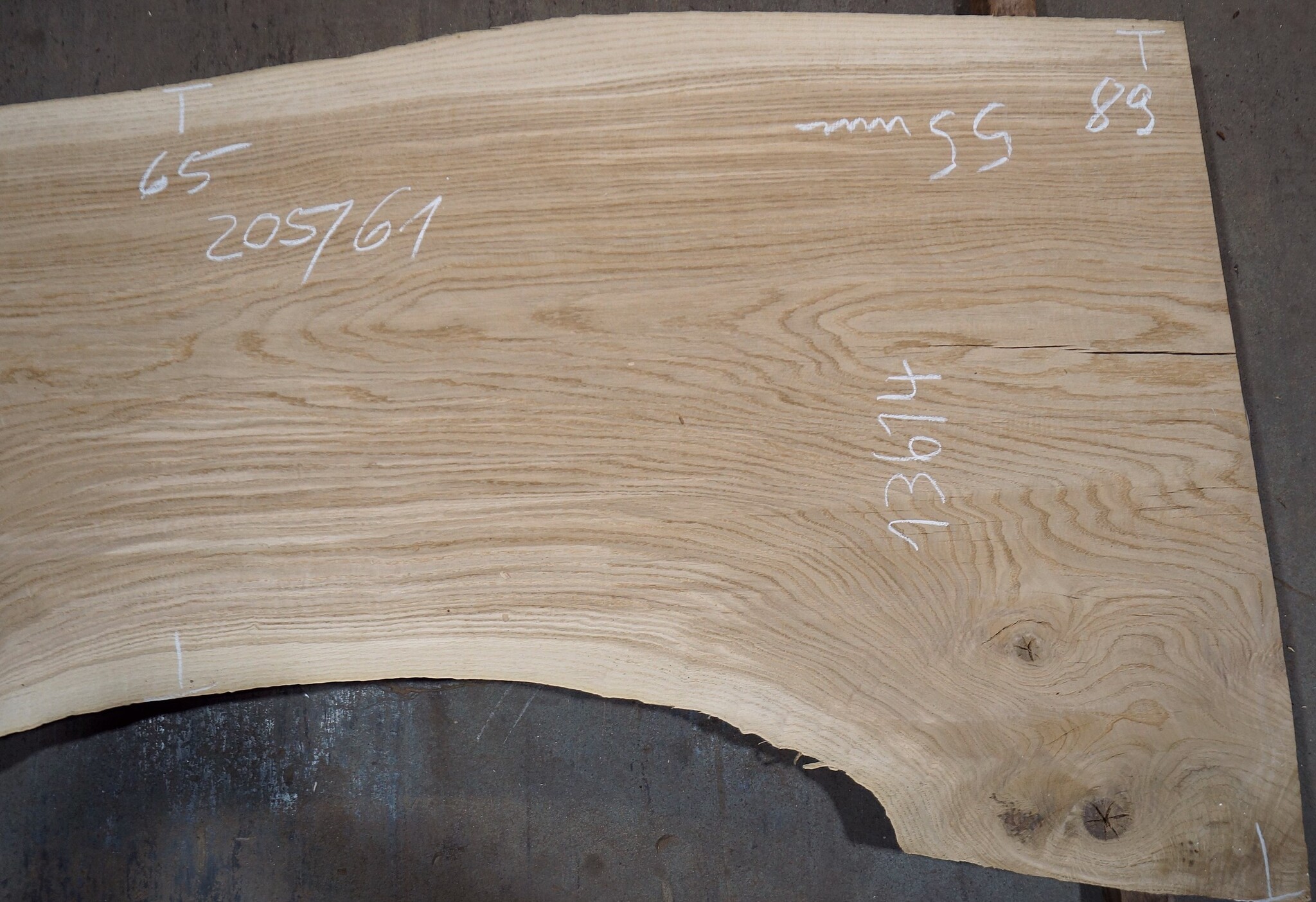 Eiche Tischplatte, ca. 2050 x 610 x 55 mm, 13614, ca. 53 kg, gefräst, künstlich getrocknet, Risse, Äste, Borkeneinwüchse. Sie erhalten das abgebildete Einzelstück.