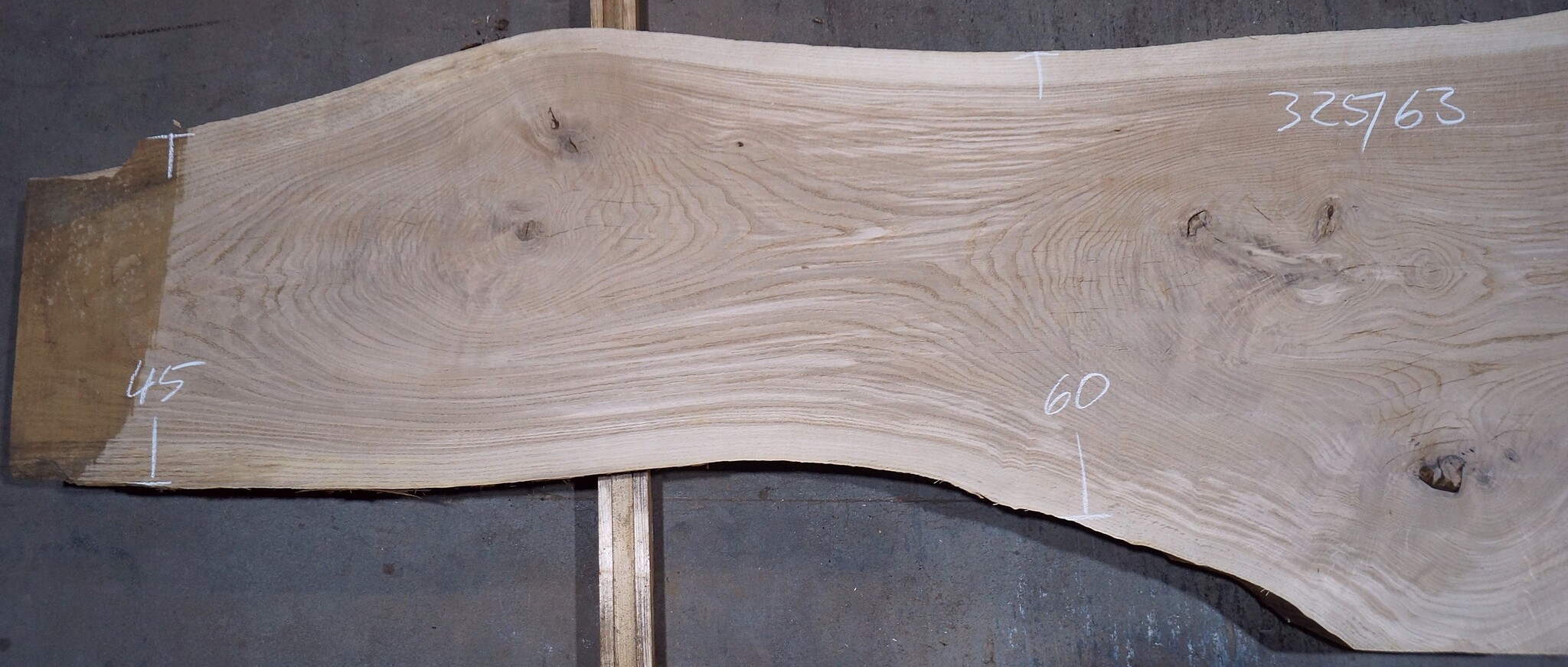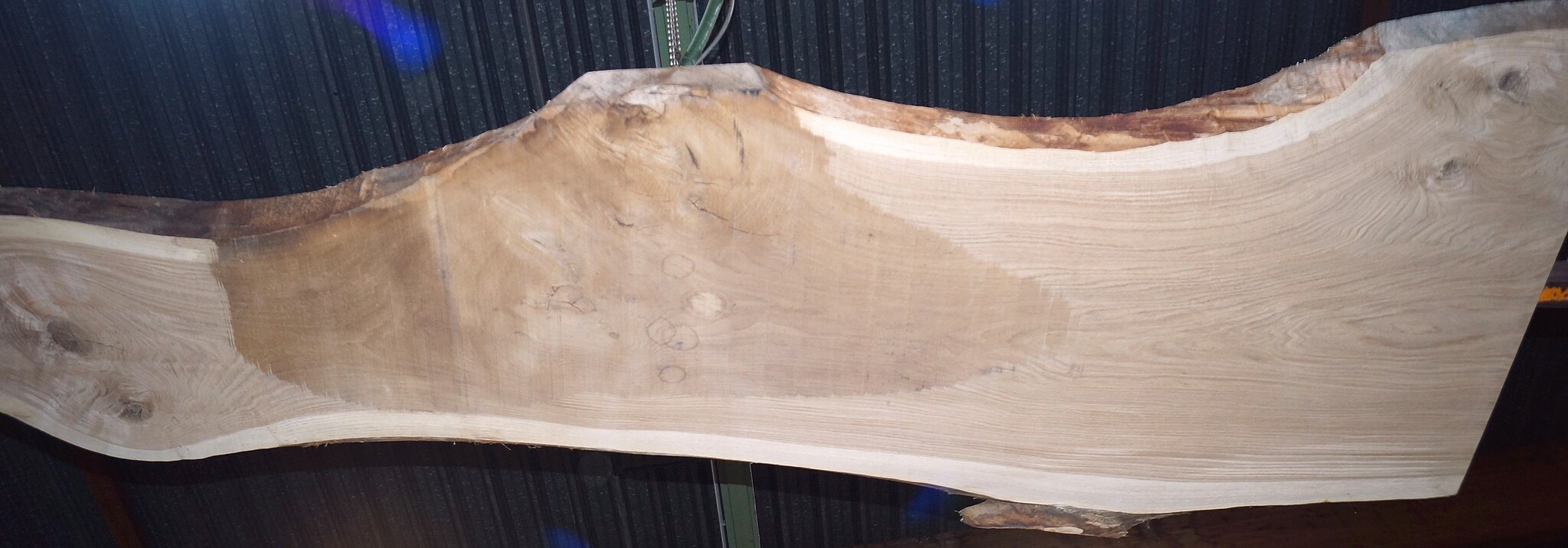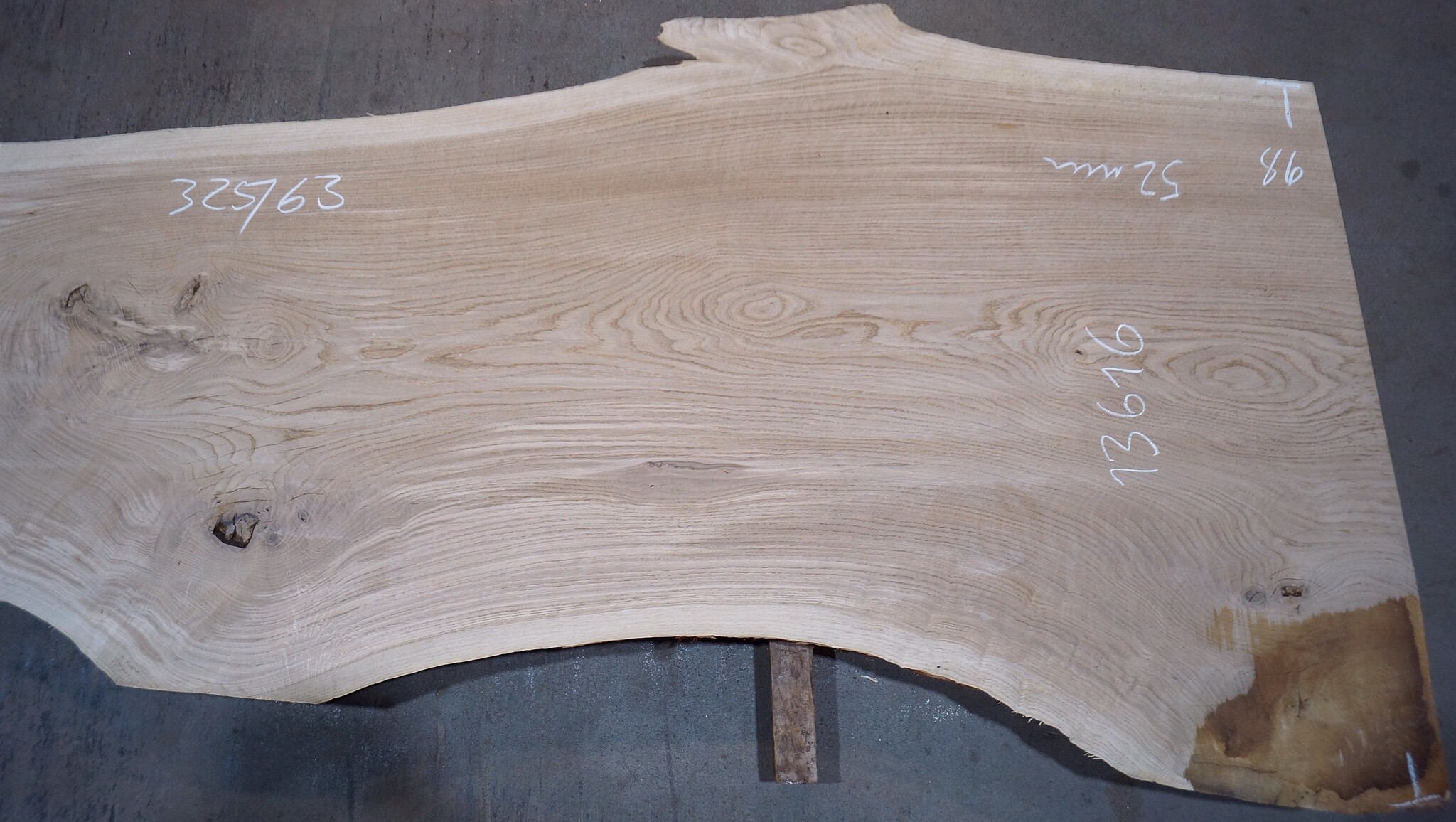 Eiche Tischplatte, ca. 3250 x 630 x 52 mm, 13616, ca. 52 kg, gefräst, künstlich getrocknet, Risse, Äste, Borkeneinwüchse. Sie erhalten das abgebildete Einzelstück.