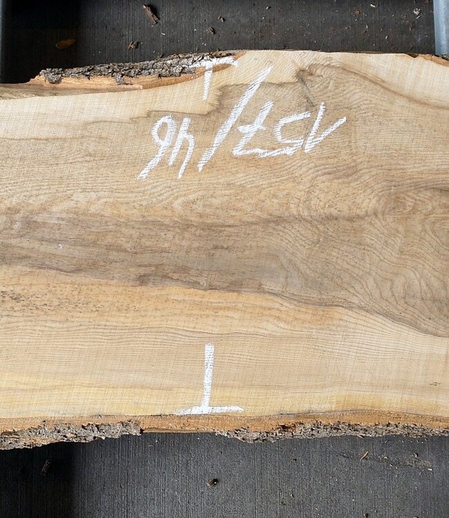 Esche Tischplatte, ca. 1570 x 460 x 52mm, 25 kg, 13108, künstlich getrocknet, Totwurm, Äste, Risse, leicht verzogen. Sie erhalten das abgebildete Einzelstück.
