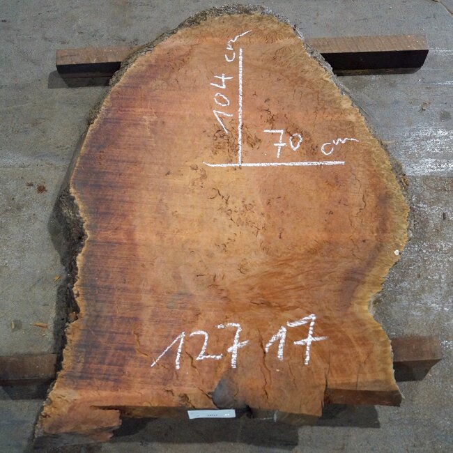 Eucalyptus Maser Tischplatte, ca. 1040 x 700(1090x820) x 52 mm, 12717, ca. 42 kg, künstlich getrocknet, gemasert, Risse, Borkeneinwüchse. Sie erhalten das abgebildete Einzelstück!