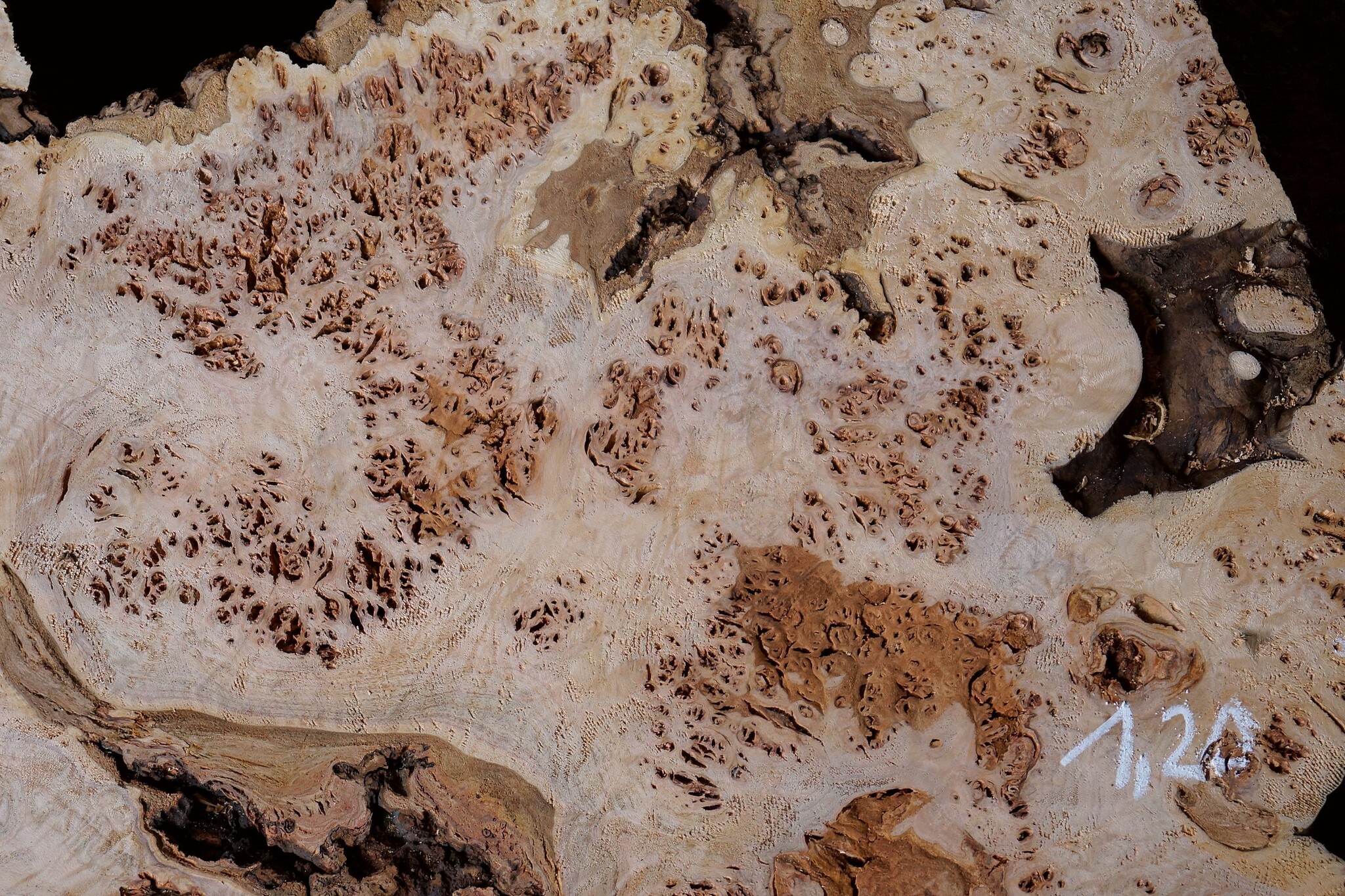 Grisard, Silberpappel, Tischplatte, gefräst, ca. 1200 x 960/780 x 55mm, 30kg, Borkeneinwuchs, Restfeuchte ca. 21%. Sie erhalten das abgebildete Einzelstück. Botanische Bezeichnung: Populus spp. Familie: Salicaceae Weitere Handelsnamen:Grisard, Graue Pappel Herkunft: Europa, Asien Nord- u. Südamerika