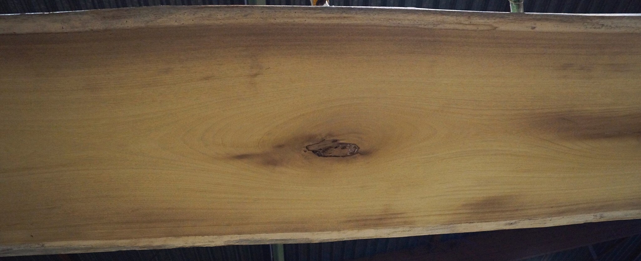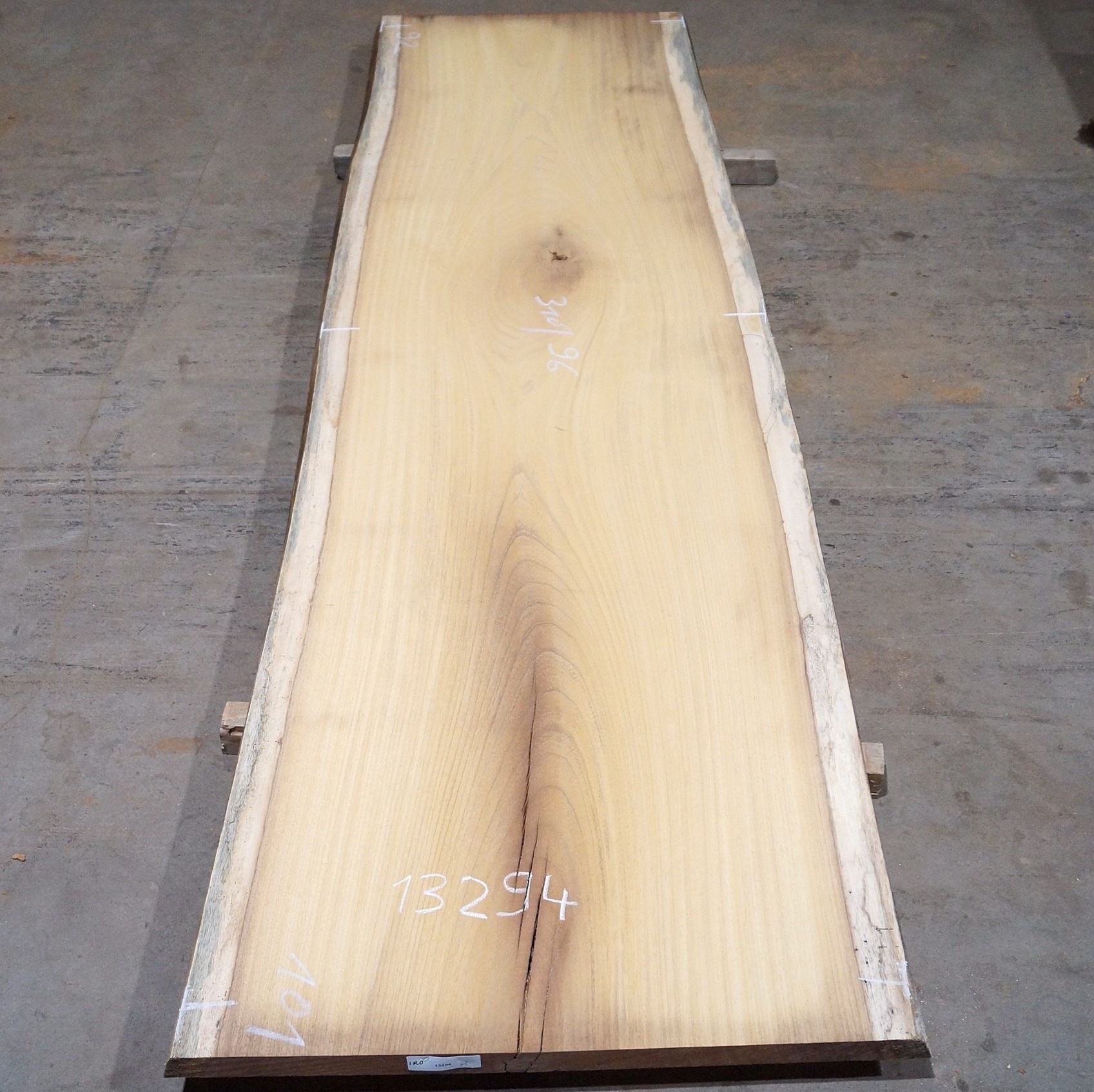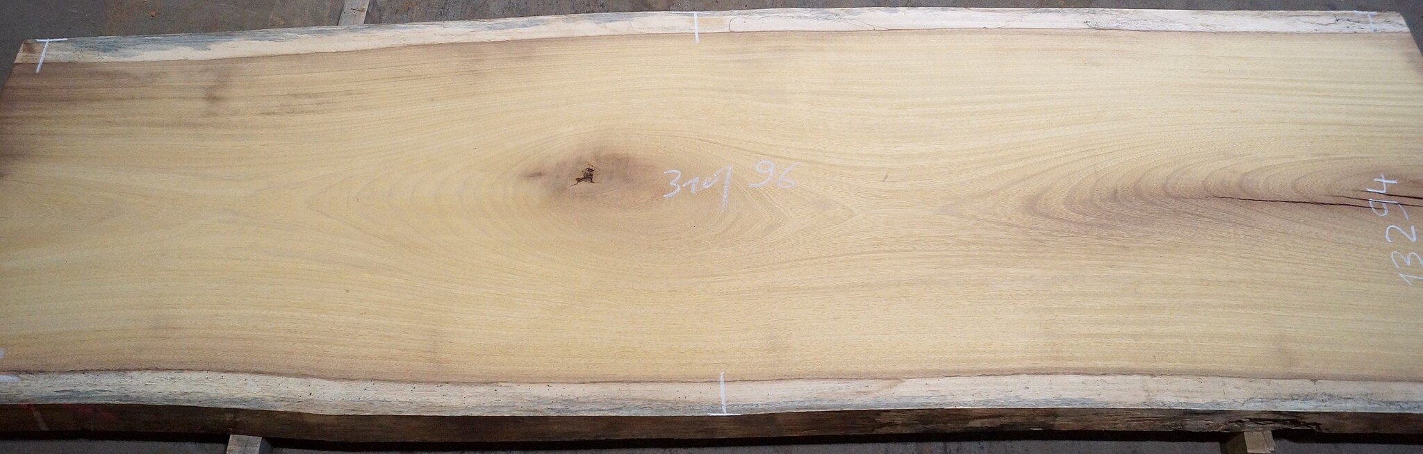 Iroko Tischplatte, gefräst, ca. 3100 x 960 x 65 mm, 13294, ca. 134 kg, künstlich getrocknet, Insektenfraß, Risse, Äste. Sie erhalten das abgebildete Einzelstück.