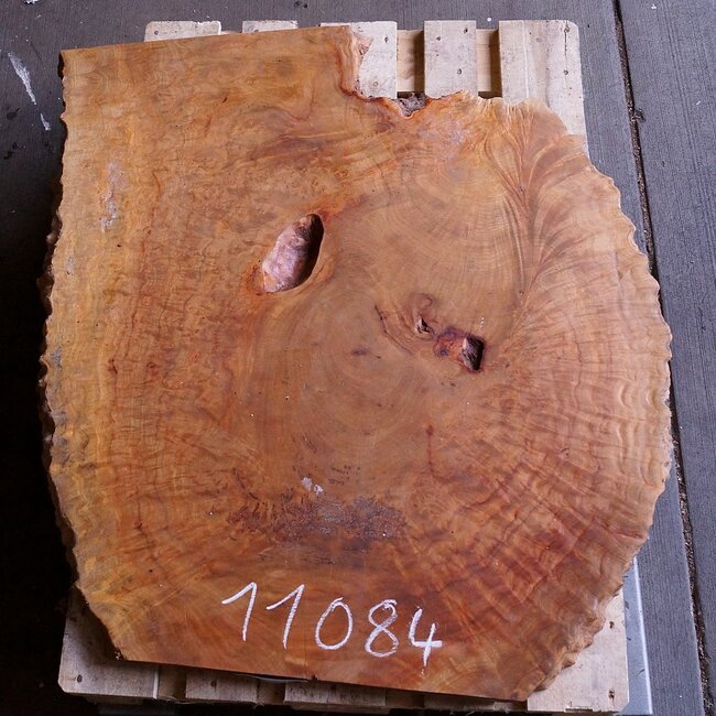 Kampfer Tischplatte, ca. 1100 x 950 x 45/50 mm, 41 kg, 11084, luftgetrocknet, Einschnitt 06/2018. Sie erhalten das abgebildete Einzelstück!