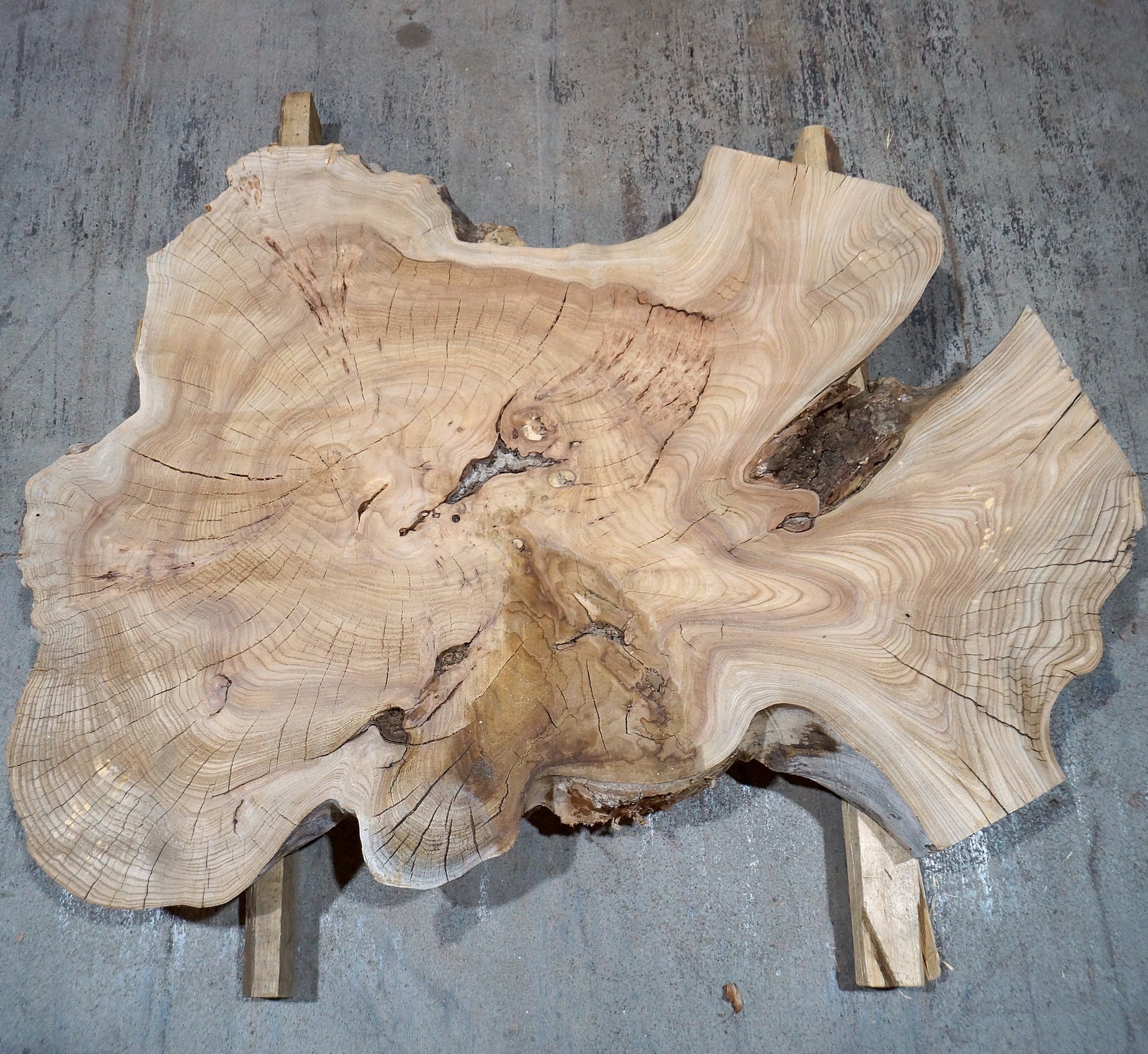 Kaukasische Rüster Baumscheibe, gefräst, ca. 1050 x 720 x 80 mm, 13709, ca. 37 kg, luftgetrocknet, lange abgelagert, Risse, Borkeneinwüchse, Lehmeinschlüsse. Sie erhalten das abgebildete Einzelstück!