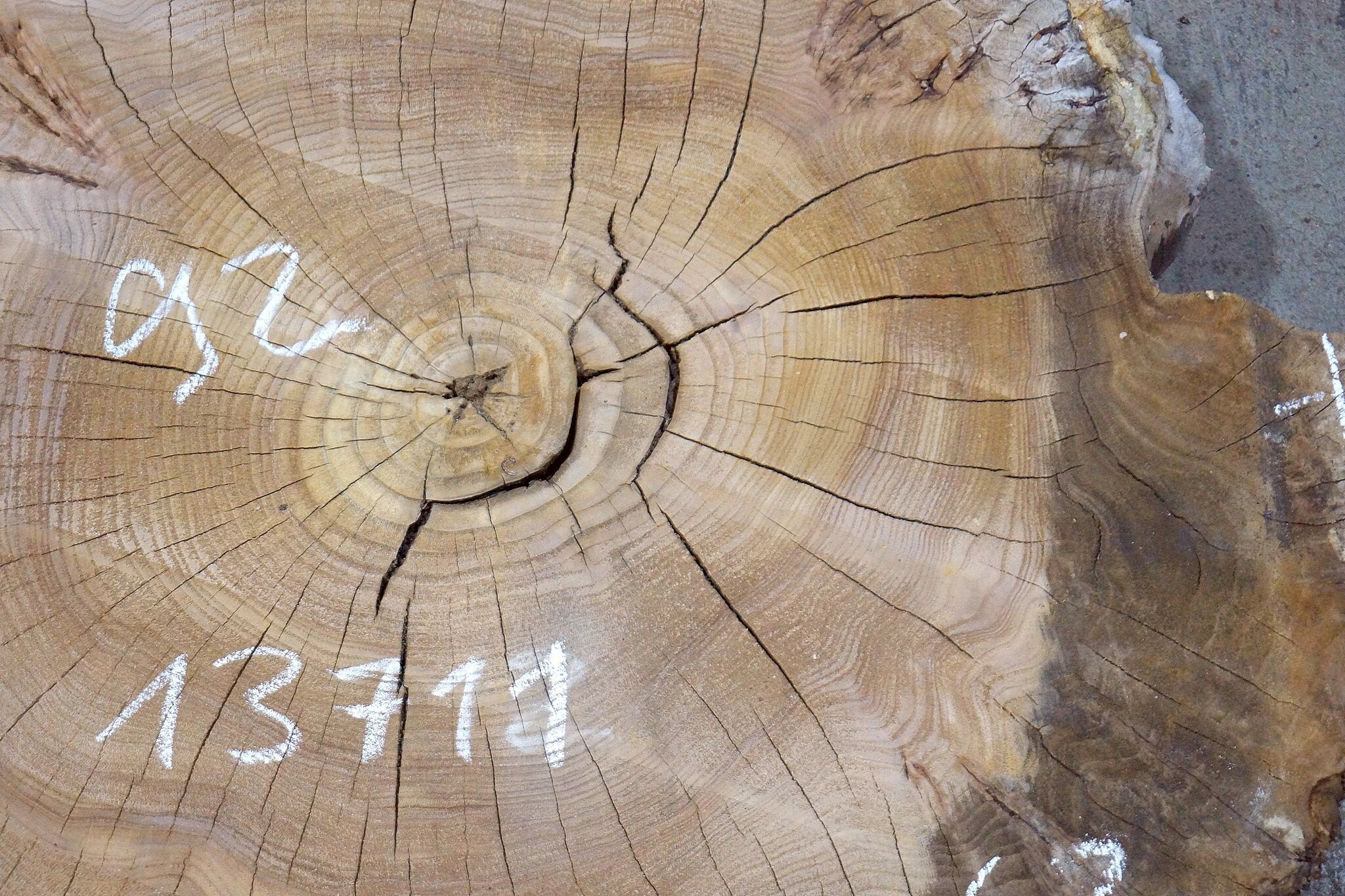 Kaukasische Rüster Baumscheibe, gefräst, ca. 920 x 620/560 x 80 mm, 13711, ca. 27 kg, luftgetrocknet, lange abgelagert, Risse. Sie erhalten das abgebildete Einzelstück!