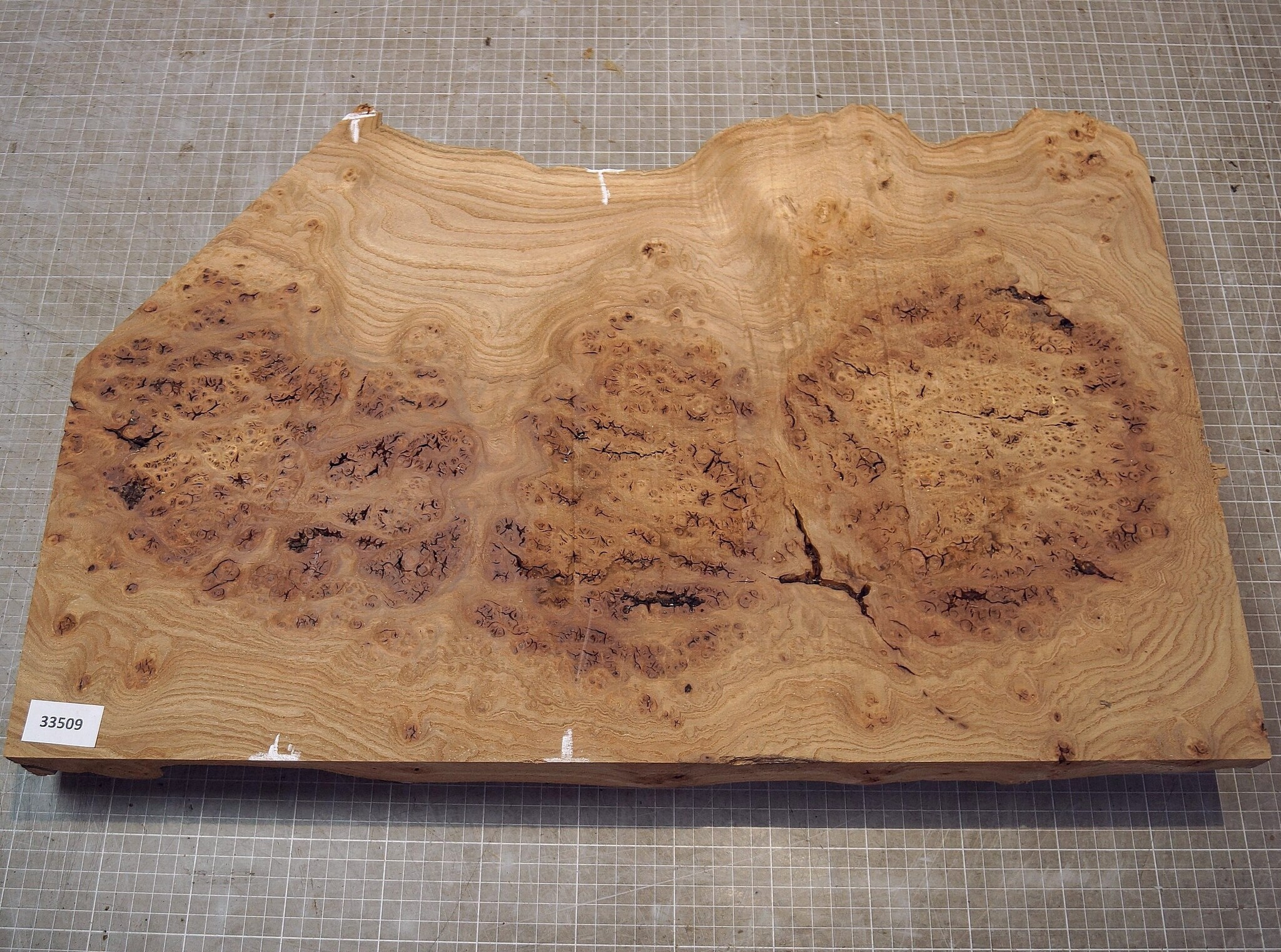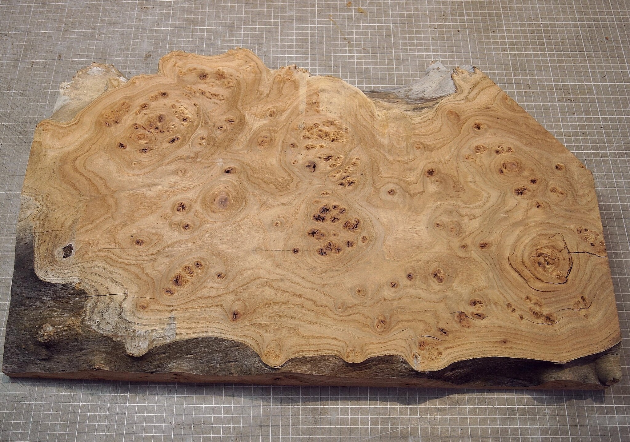 Kaukasische Rüster Maser, ca. 626 x 355-405 x 62mm, 7,44kg, luftgetrocknet, Borkeneinwuchs, Risse, Äste. Sie erhalten das abgebildete Einzelstück!