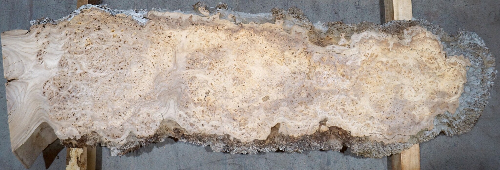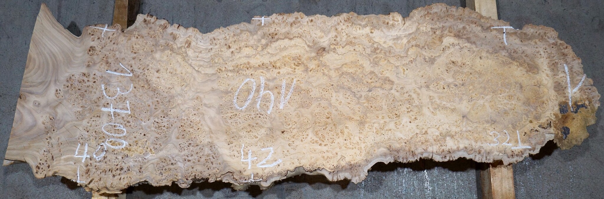 Kaukasische Rüster Maserplatte, gefräst, ca. 1400 x 400 x 50 mm, 13700, ca. 21 kg, luftgetrocknet, lange abgelagert, Risse, Borkeneinwüchse. Sie erhalten das abgebildete Einzelstück!