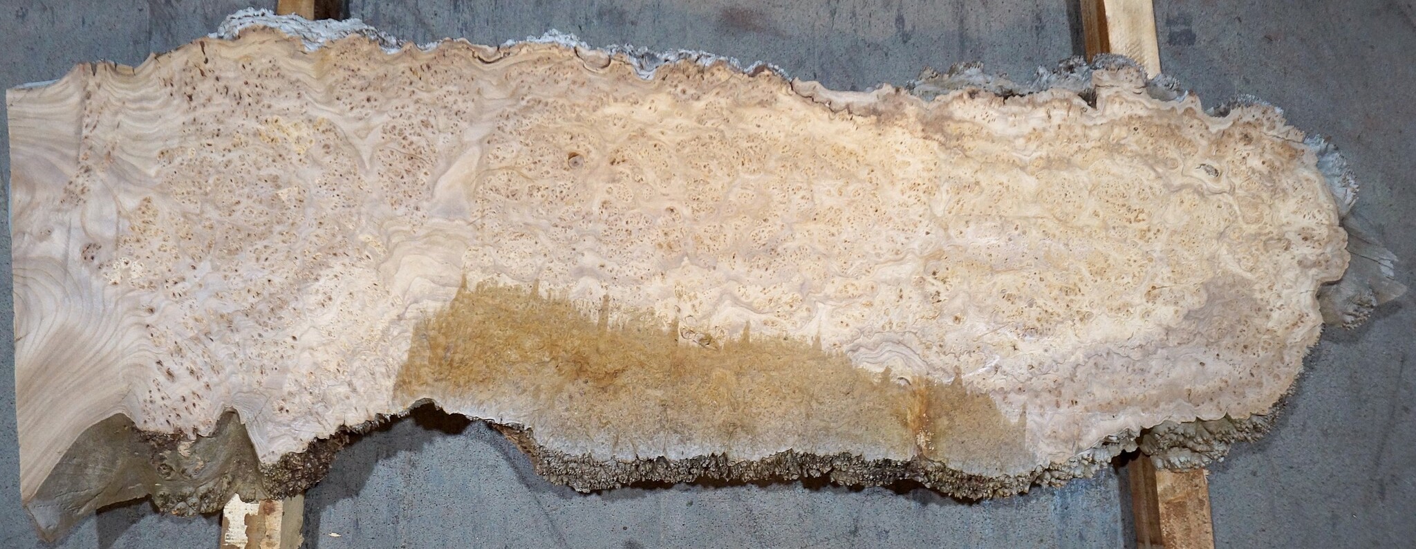 Kaukasische Rüster Maserplatte, gefräst, ca. 1450 x 420 x 40 mm, 13699, ca. 16 kg, luftgetrocknet, lange abgelagert, Risse, Borkeneinwüchse. Sie erhalten das abgebildete Einzelstück!