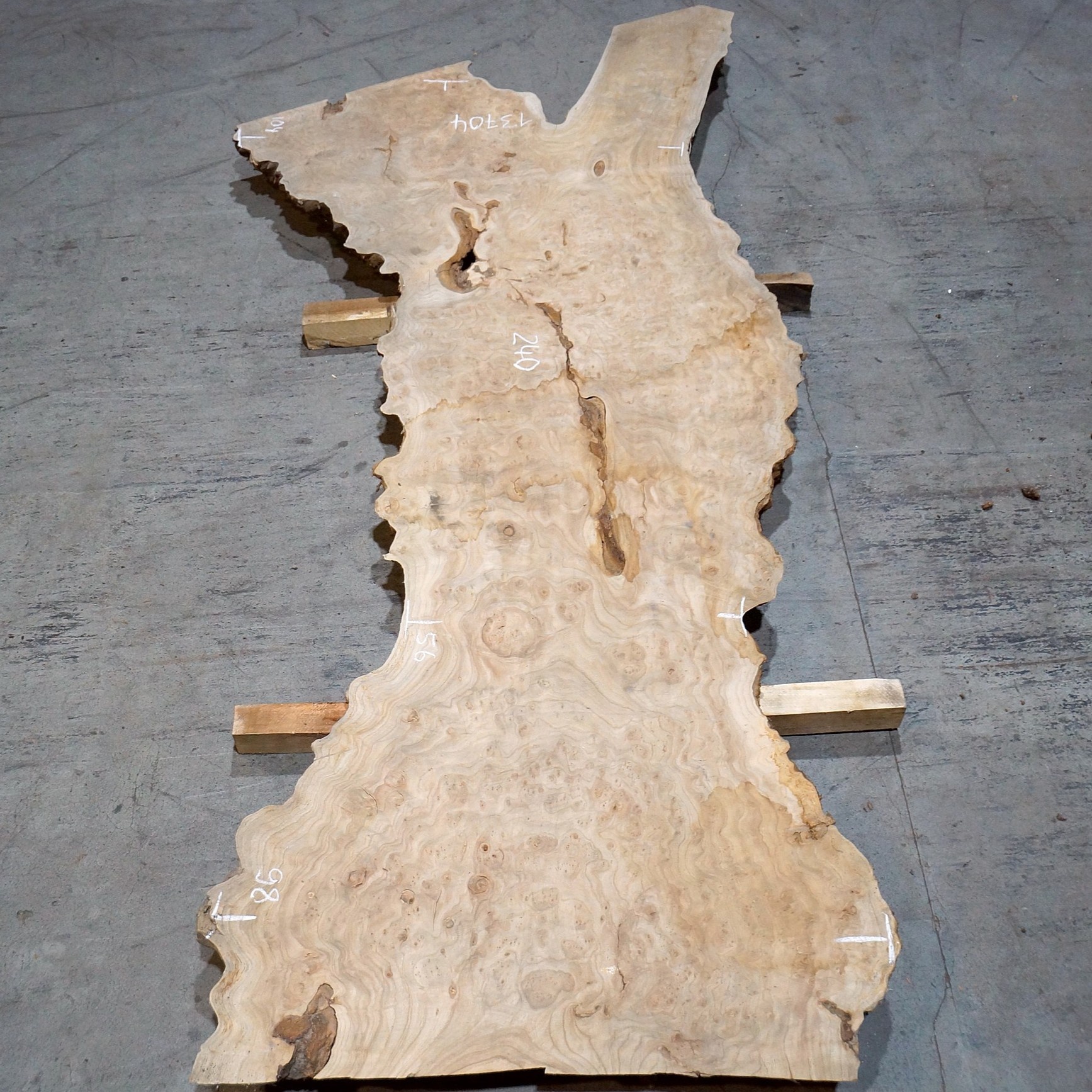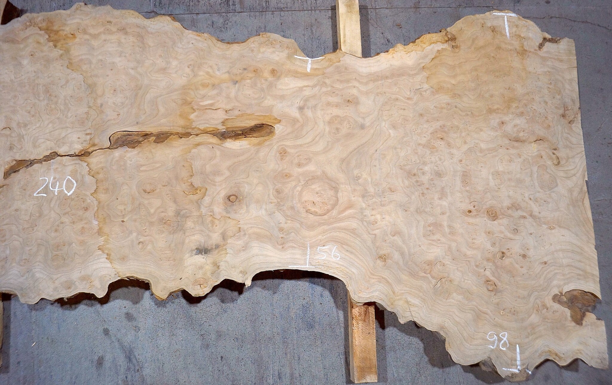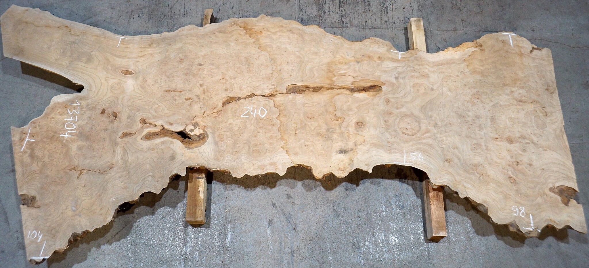 Kaukasische Rüster Maserplatte, gefräst, ca. 2400 x 980 x 62 mm, 13704, ca. 90 kg, luftgetrocknet, lange abgelagert, geschüsselt, Borkeneinwüchse. Sie erhalten das abgebildete Einzelstück!