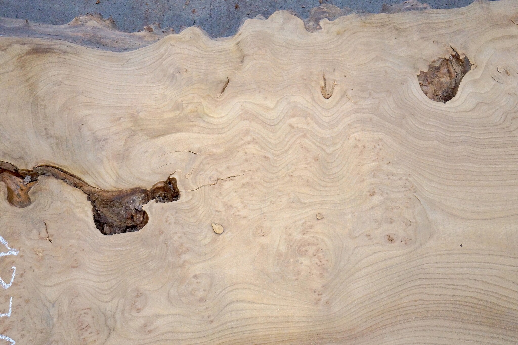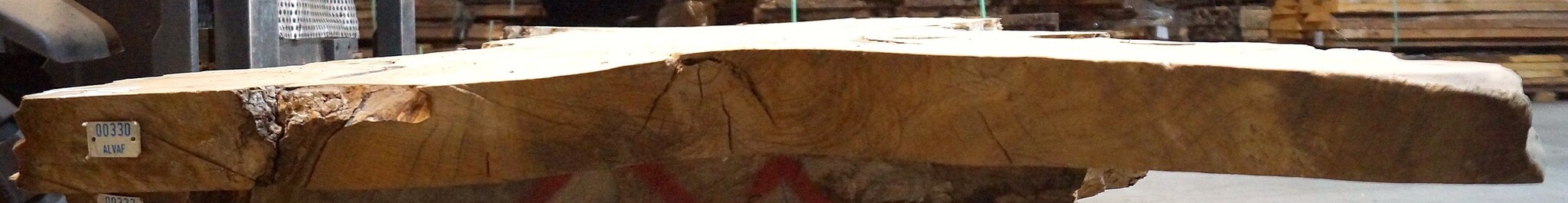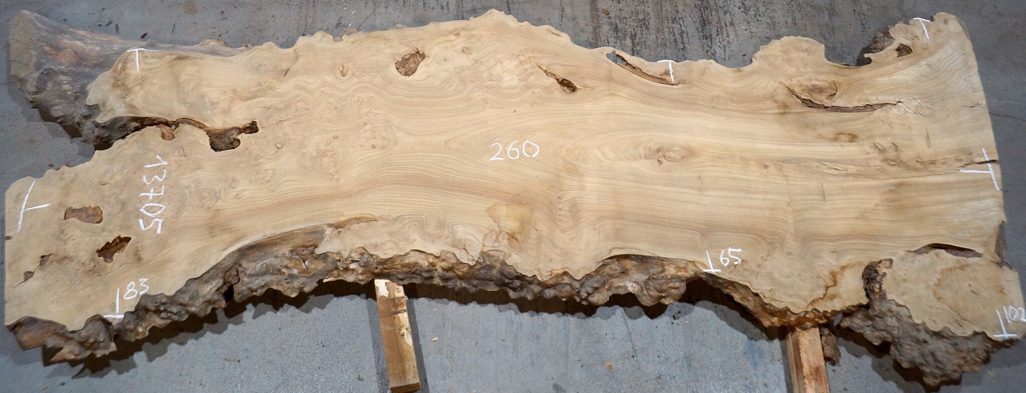 Kaukasische Rüster Maserplatte, gefräst, ca. 2600 x 830 x 62 mm, 13705, ca. 82 kg, luftgetrocknet, lange abgelagert, geschüsselt, verzogen, Borkeneinwüchse. Sie erhalten das abgebildete Einzelstück!