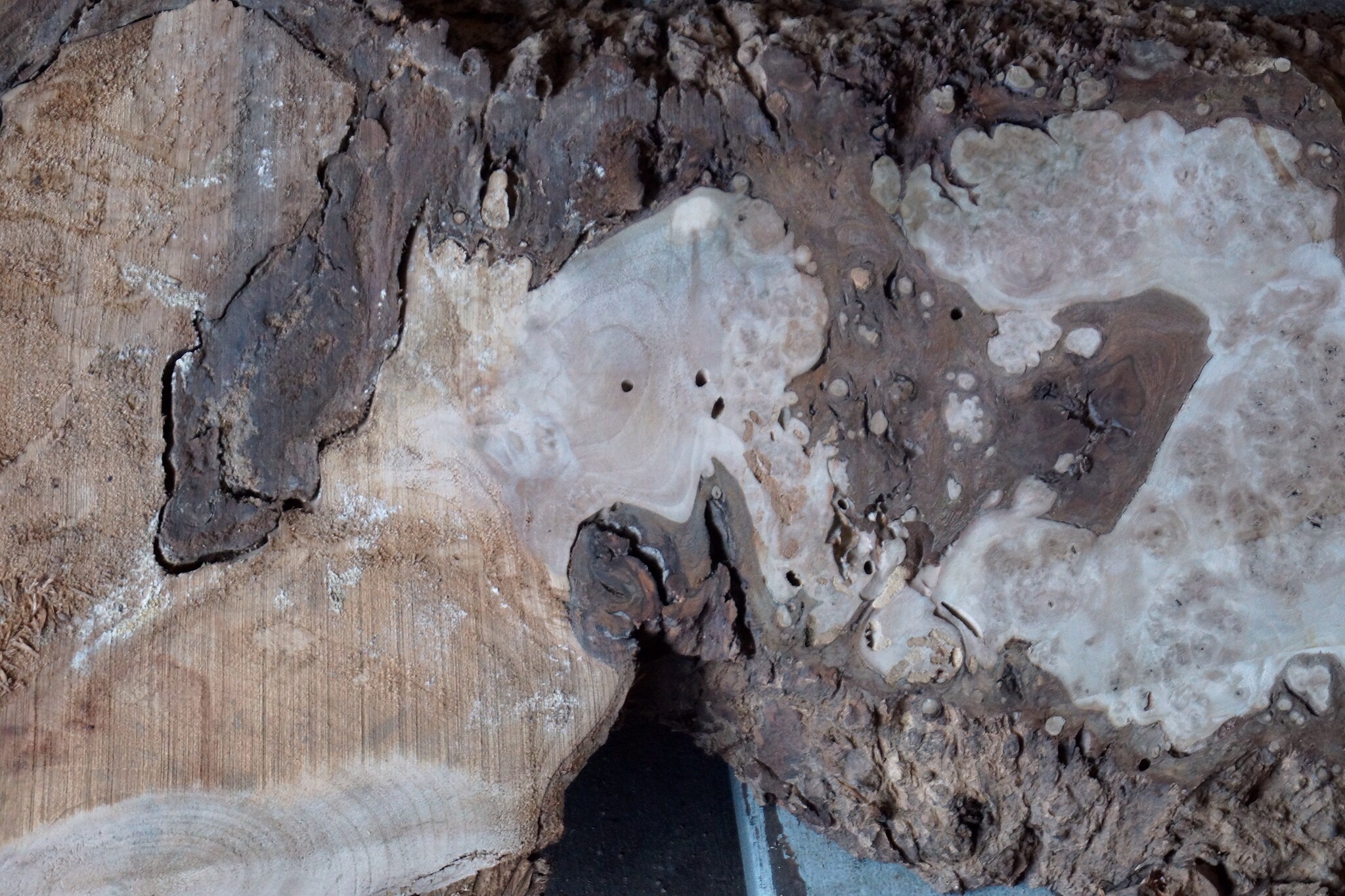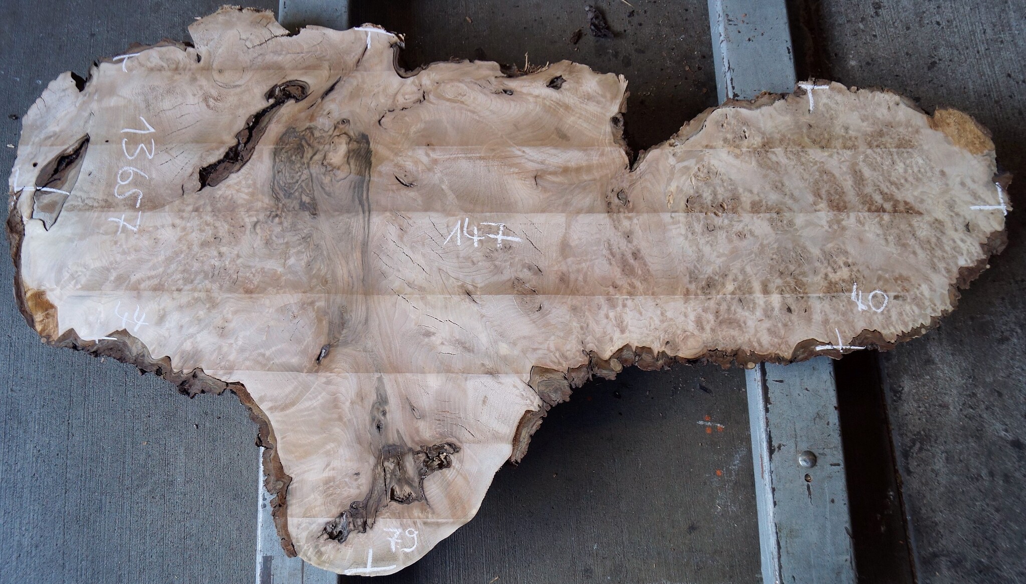 Kaukasischer Nussbaum, gefräst, Maser, ca. 1470 x 440 x 60 mm, 13657, ca. 23 kg. Luftgetrocknet, lange abgelagert, Risse, Äste, Borkeneinwüchse, Insektenfraß. Sie erhalten das abgebildete Einzelstück.