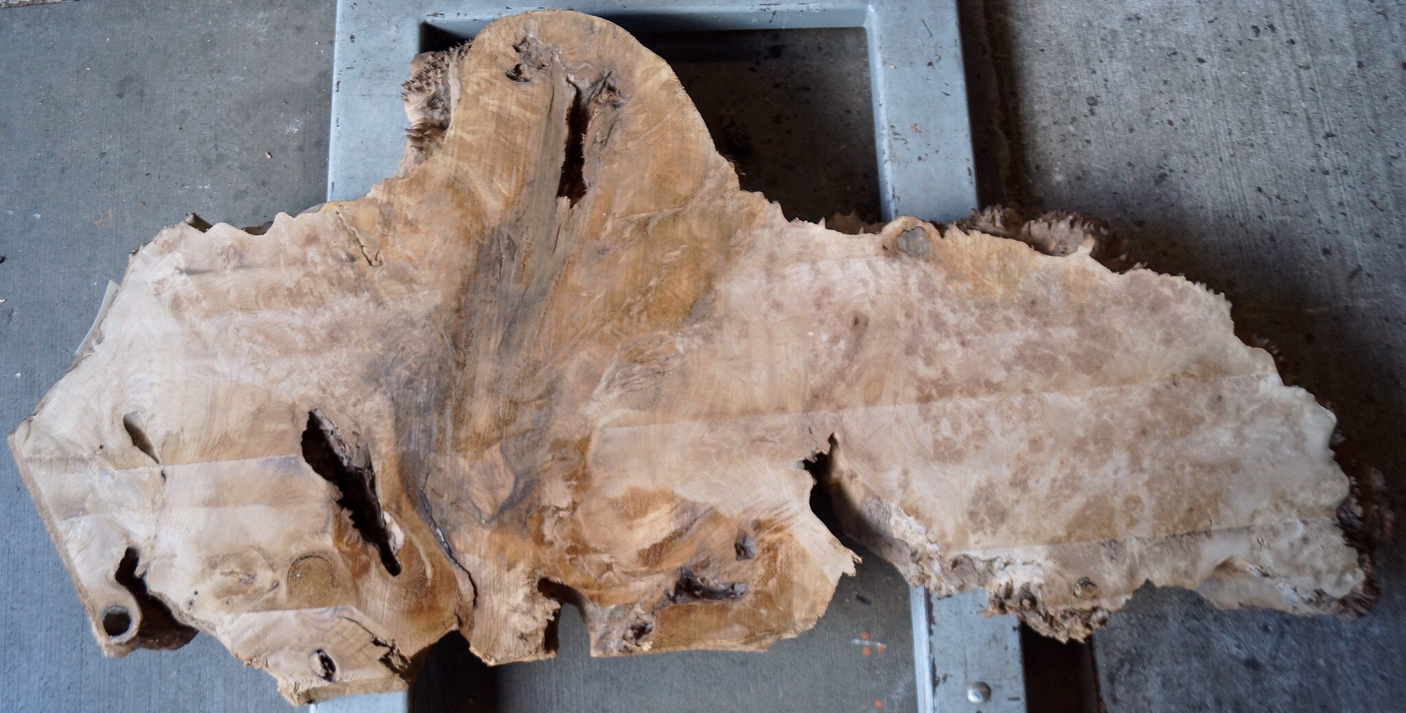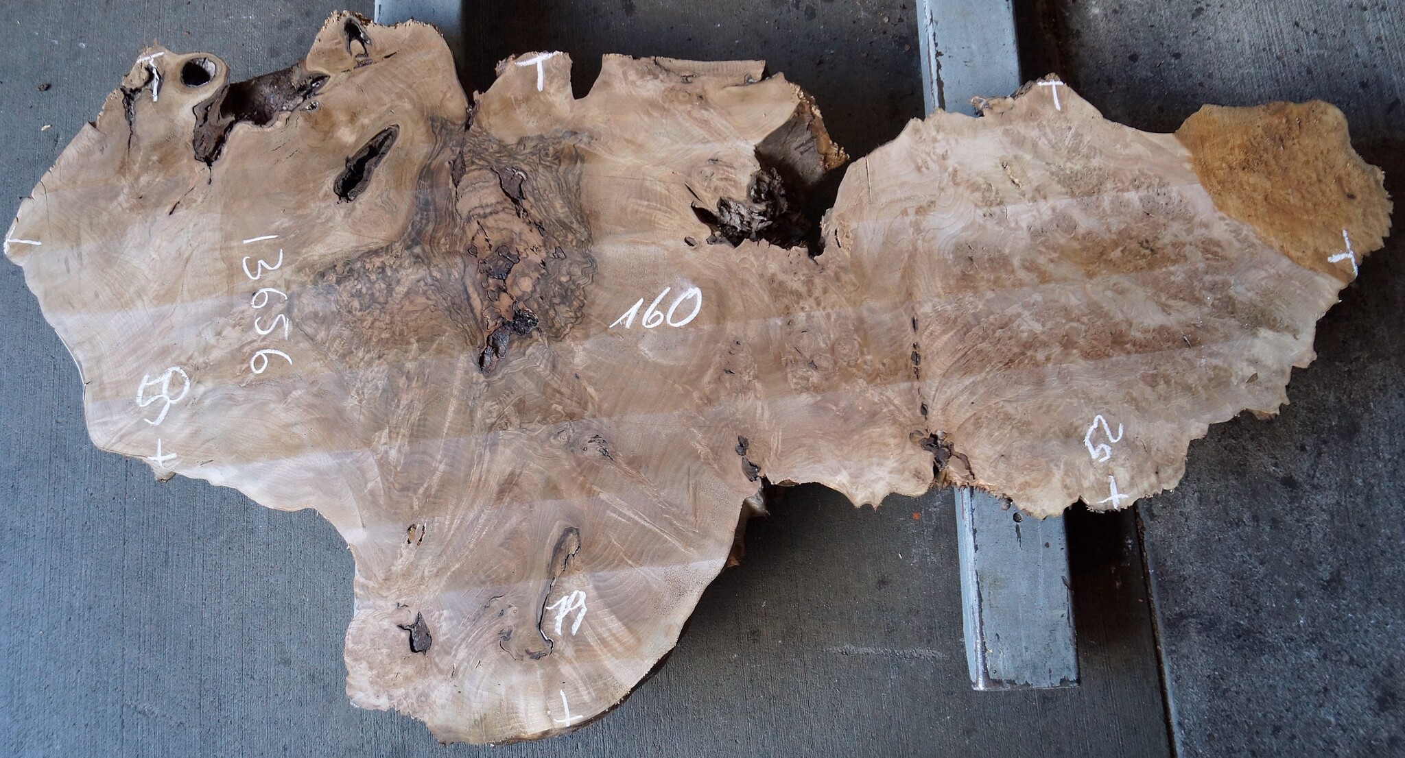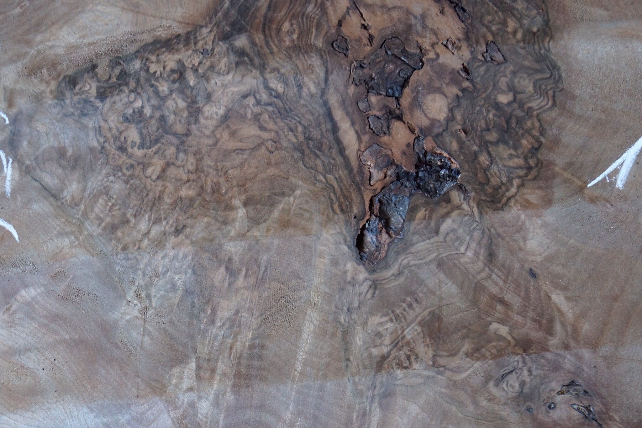 Kaukasischer Nussbaum, gefräst, Maser, ca. 1600 x 500 x 60 mm, 13656, ca. 30 kg. Luftgetrocknet, lange abgelagert, Risse, Äste, Borkeneinwüchse, Insektenfraß. Sie erhalten das abgebildete Einzelstück.