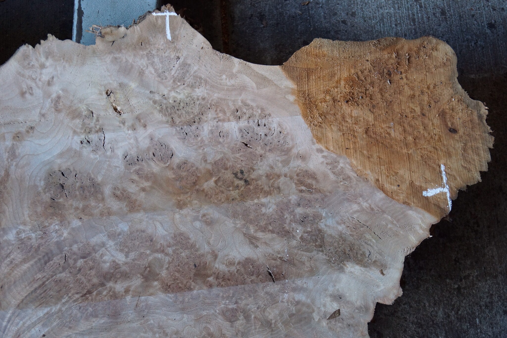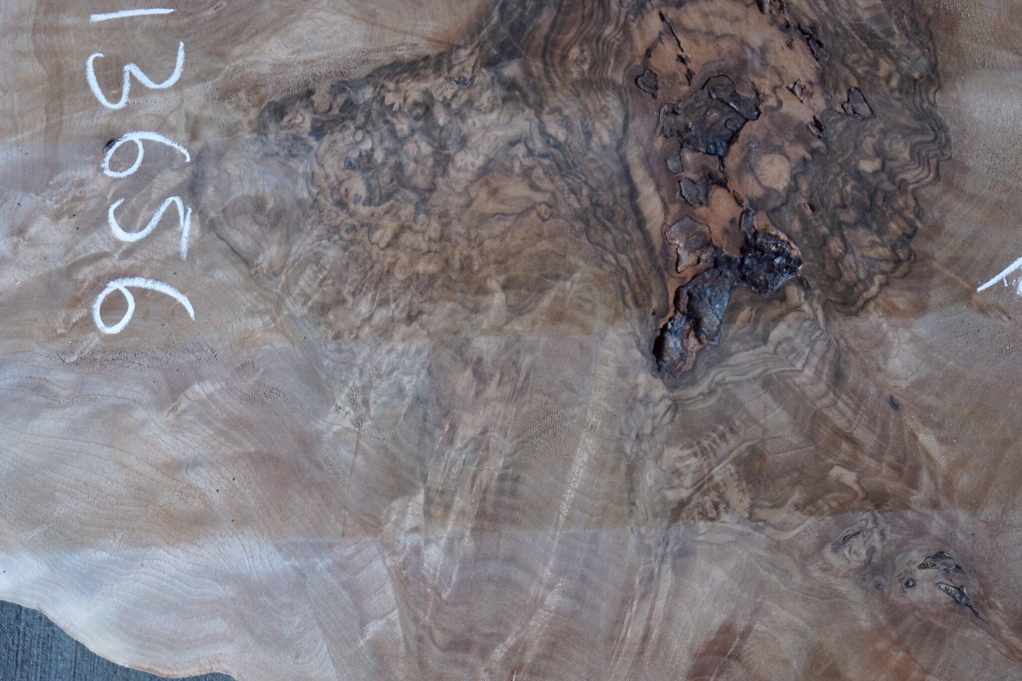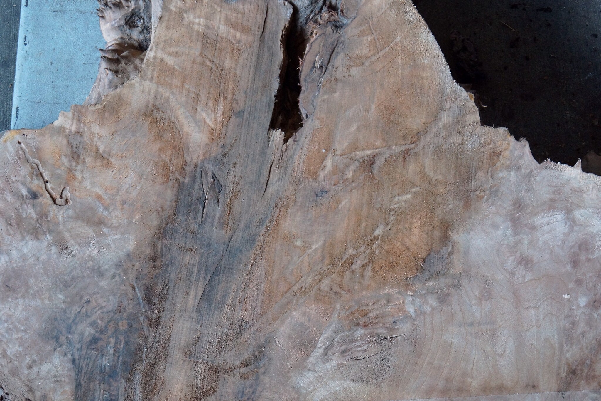 Kaukasischer Nussbaum, gefräst, Maser, ca. 1600 x 500 x 60 mm, 13656, ca. 30 kg. Luftgetrocknet, lange abgelagert, Risse, Äste, Borkeneinwüchse, Insektenfraß. Sie erhalten das abgebildete Einzelstück.