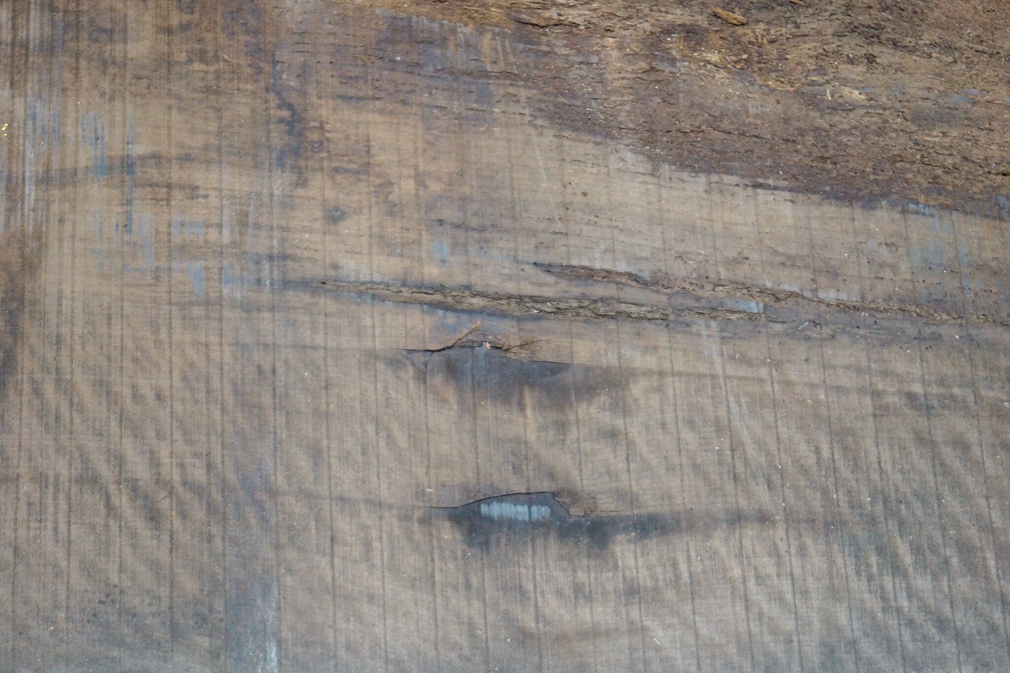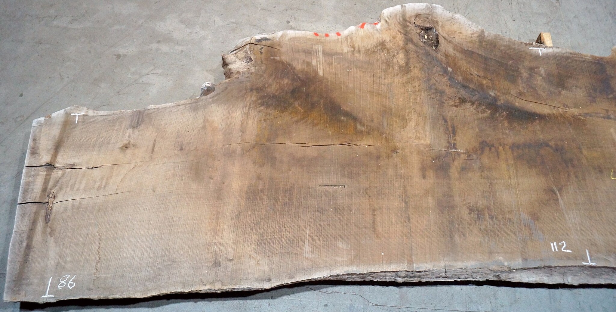 Kaukasischer Nussbaum, Tischplatte, ca. 4700 x 1120 x 80 mm, 13681, ca. 270 kg, luftgetrocknet, lange abgelagert, Äste, Risse, Faulstelle, Borkeneinwüchse, Insektenfraß, Einschnitt, verzogen. Sie erhalten das abgebildete Einzelstück.