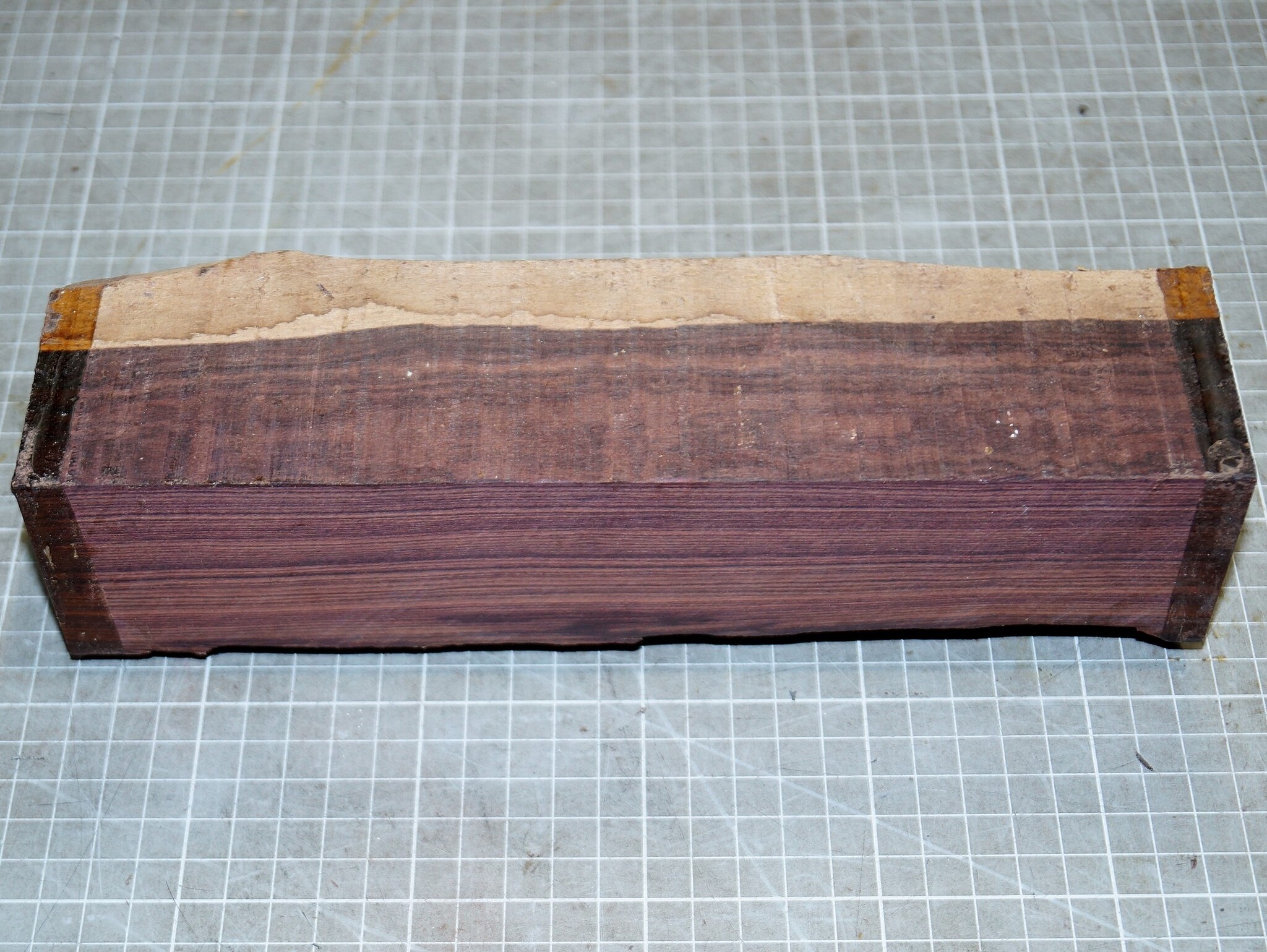 Königsholz, Veilchenholz, ca. 254 x 46-73 x 68mm, 1,08kg, luftgetrocknet, Splint, Kernrisse, Einschnitt 2016. Sie erhalten das abgebildete Einzelstück!