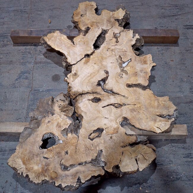 Olive Platte, gefräst, ca. 1200 x 600 x 45 mm, 12523, 12,5 kg, luftgetrocknet, Einschnitt 08/2019. Risse, enthält Lehm/Beton. Sie erhalten das abgebildete Einzelstück.