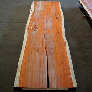 Padouk Tischplatte, gefräst, ca. 4100 x 1150 x 60 mm, 13420, ca. 206 kg, künstlich getrocknet, Risse, Borkeneinwüchse, Insektenfraß im Splint. Sie erhalten das abgebildete Einzelstück