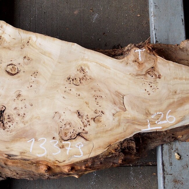 Pappel Maser Tischplatte, ca. 1330 x 260/500 x 60mm, 12kg, künstlich getrocknet, geschliffen, leicht verzogen, Risse. Sie erhalten das abgebildete Einzelstück.