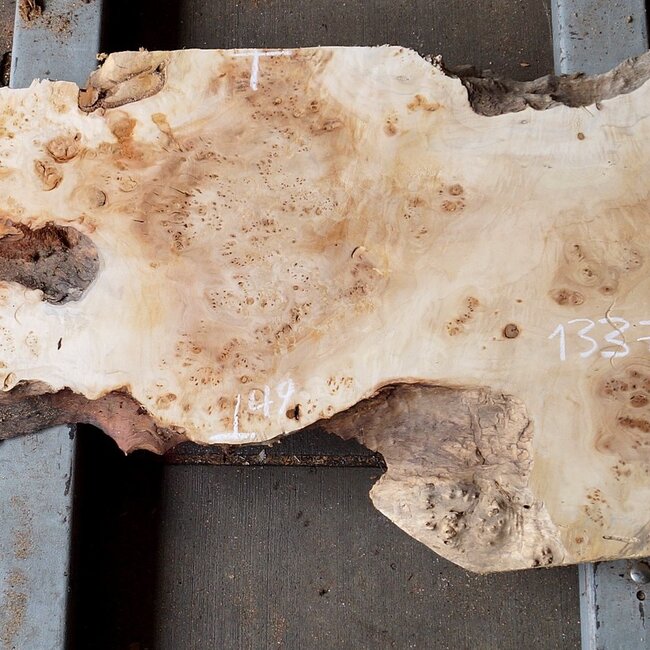 Pappel Maser Tischplatte, ca. 1810 x 490/610 x 60mm, 26kg, künstlich getrocknet, geschliffen, leicht verzogen. Sie erhalten das abgebildete Einzelstück.