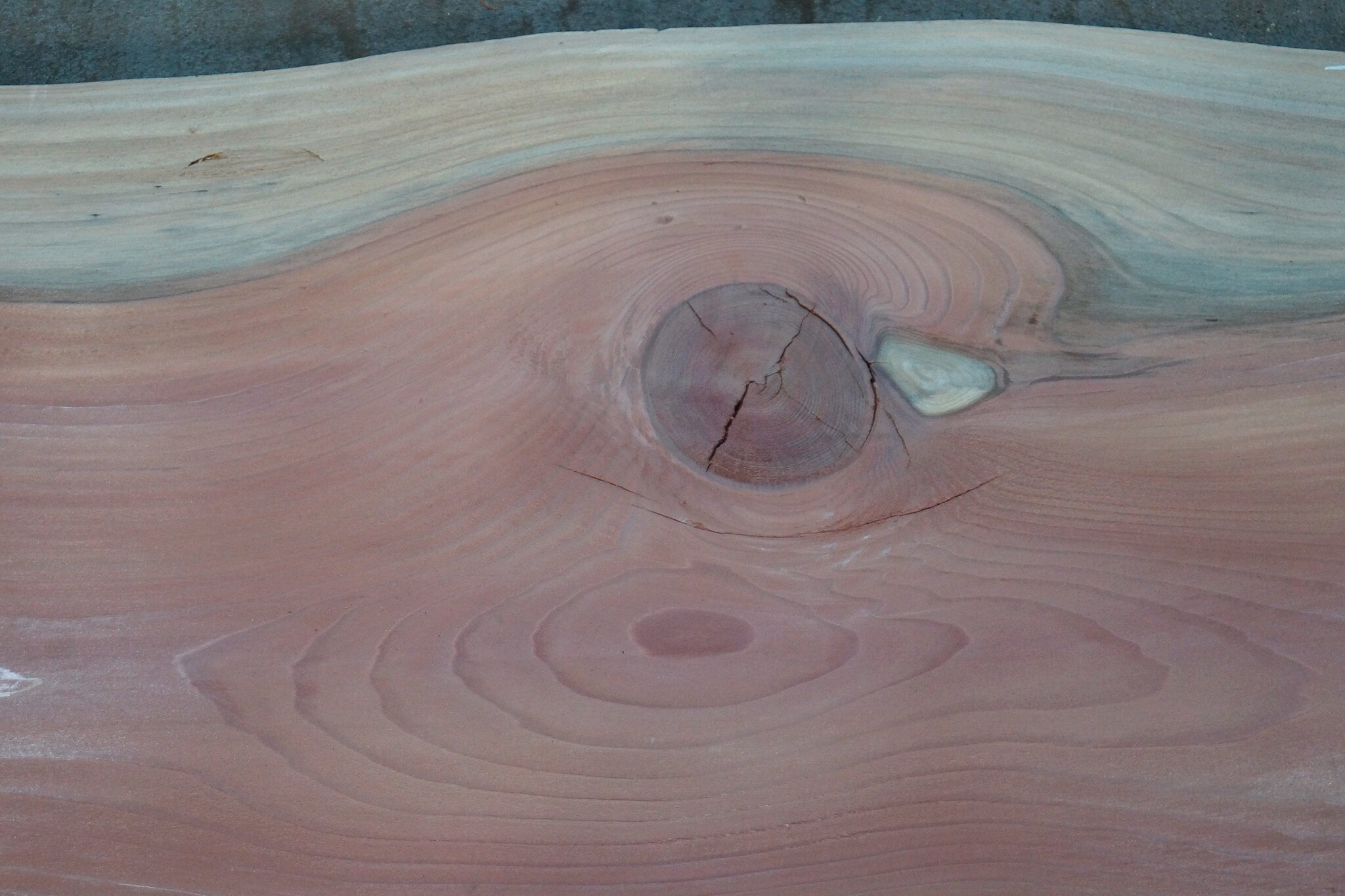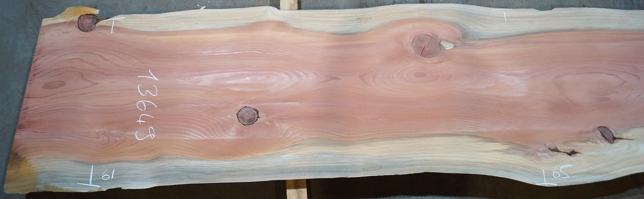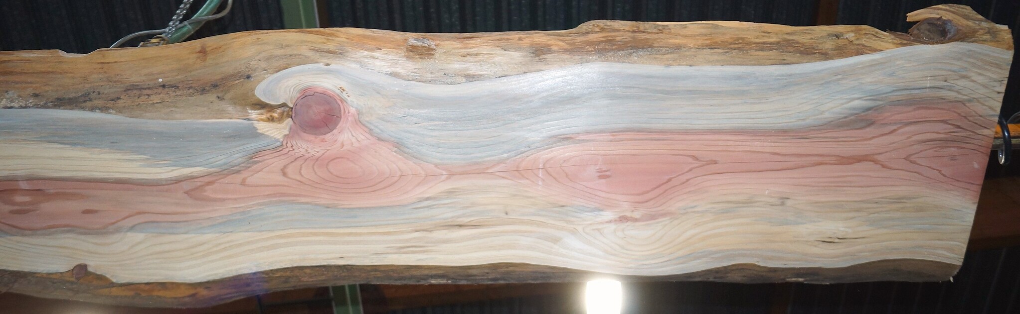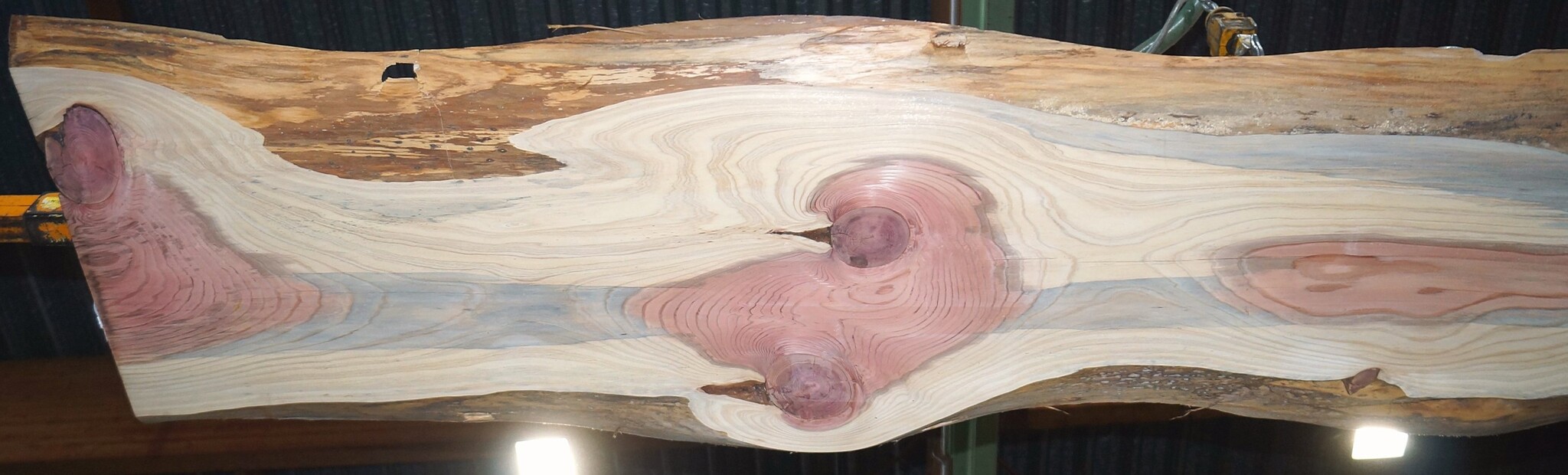 Redwood Tischplatte, gefräst, ca. 3900 x 610/650/740 x 50 mm, 13649, ca. 52 kg, künstlich getrocknet, Äste, Risse, viel Splint. Sie erhalten das abgebildete Einzelstück!
