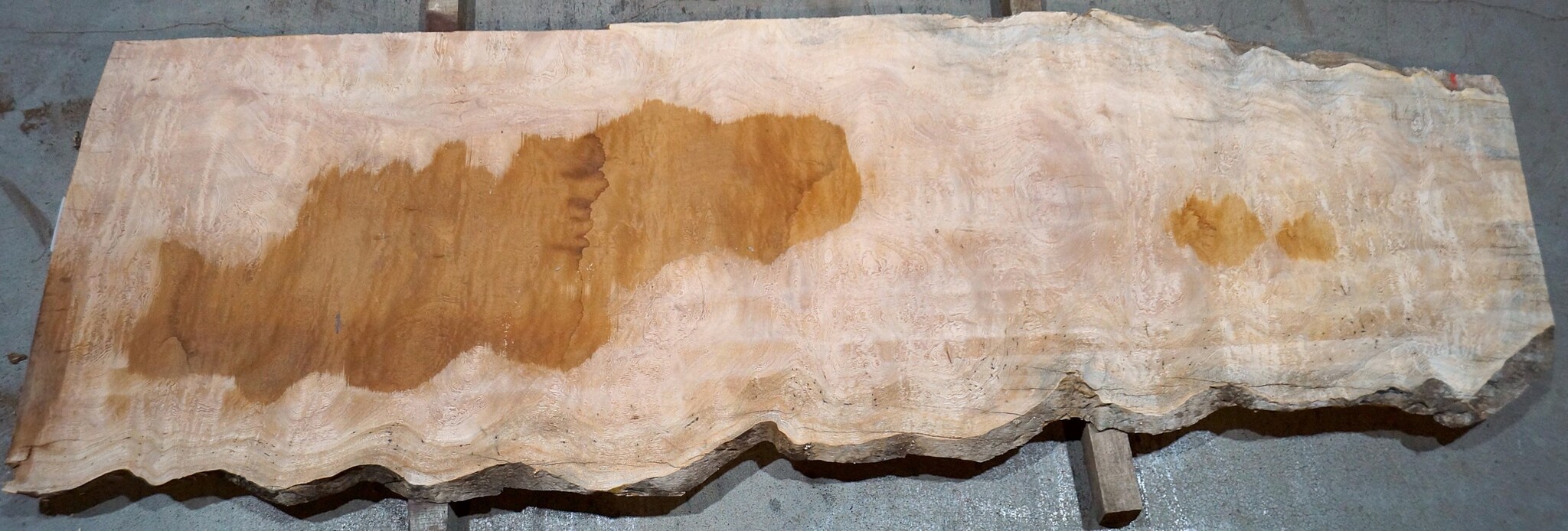 Sapeli Mahagoni, Tischplatte, gefräst, ca. 2450 x 810/590 x 35 mm, 13685, ca. 35 kg, leicht pommeliert, künstlich getrocknet, Insektenfraß im Splint, Risse. Sie erhalten das abgebildete Einzelstück.