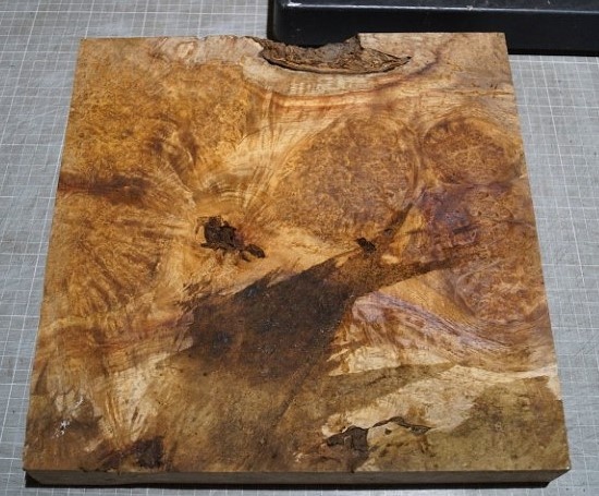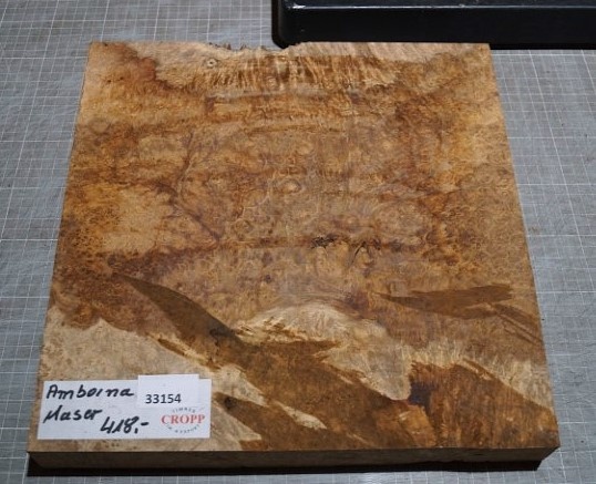 Amboyna Burl, approx. 325 x 325 x 40-65mm, air dried, cut approx. 11.2023, ingrown bark. You will receive the product as shown.