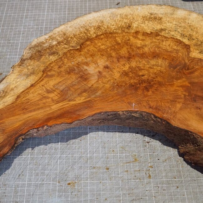 Amboyna Burl, approx. 690 x 195/300/240 x 54mm, 6,28kg, air dried, cut in 11/2023. You will receive the product as shown.