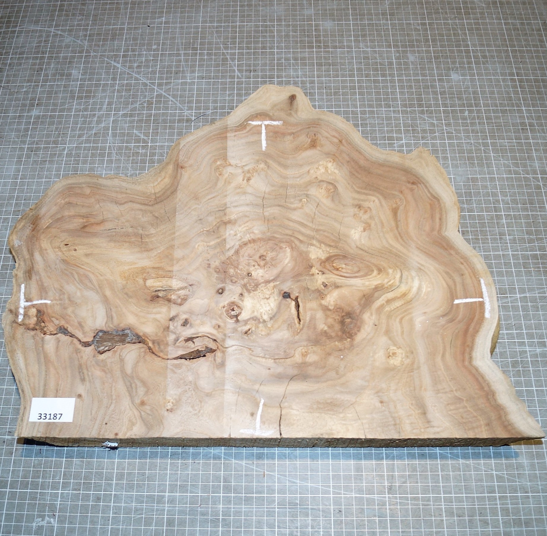 Caucasian Elm burl, approx. 430 x 330 x 69mm, 5,8kg. airdried, bark inclusion, cracks, knots. You will receive the product as shown.