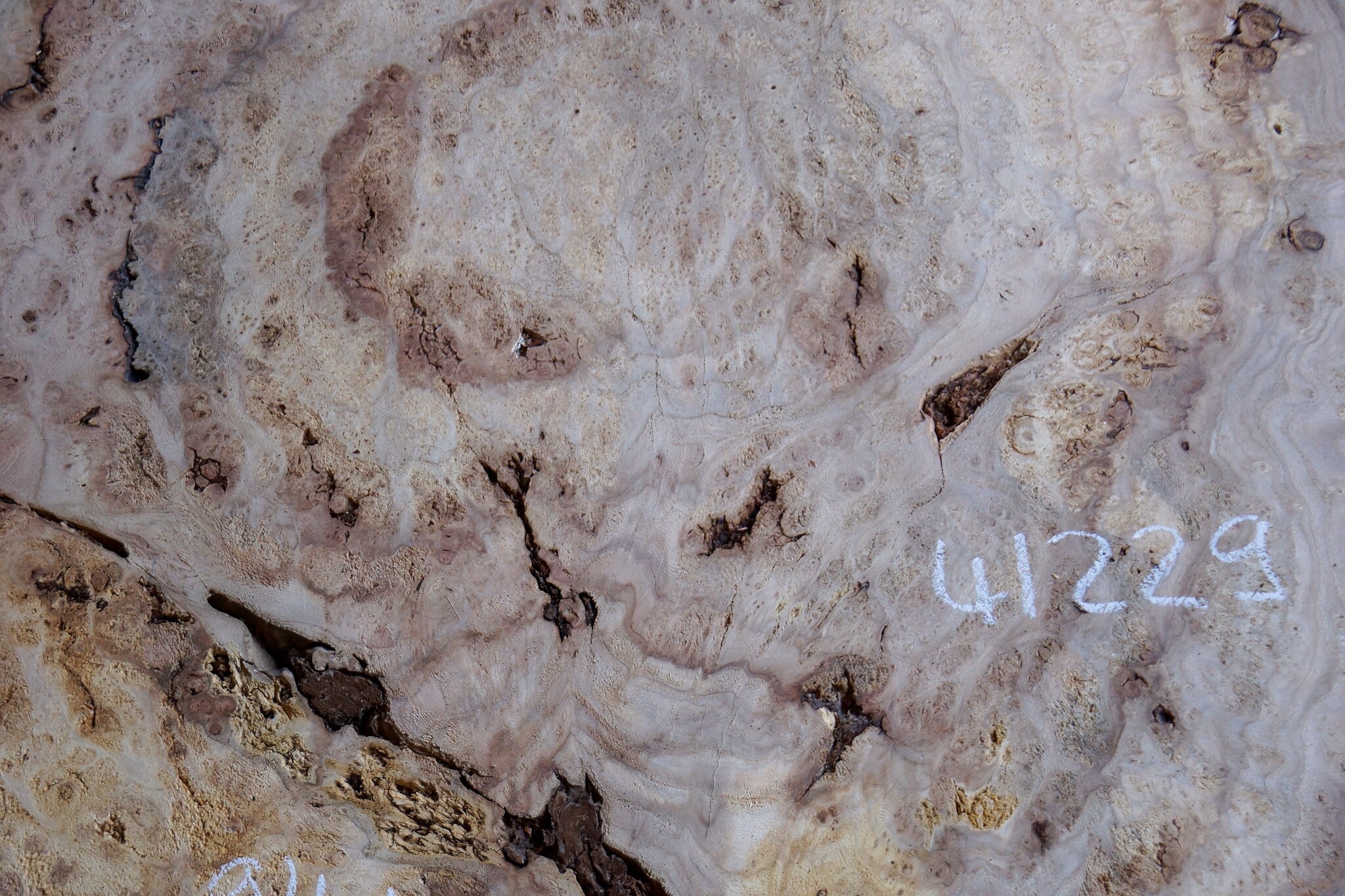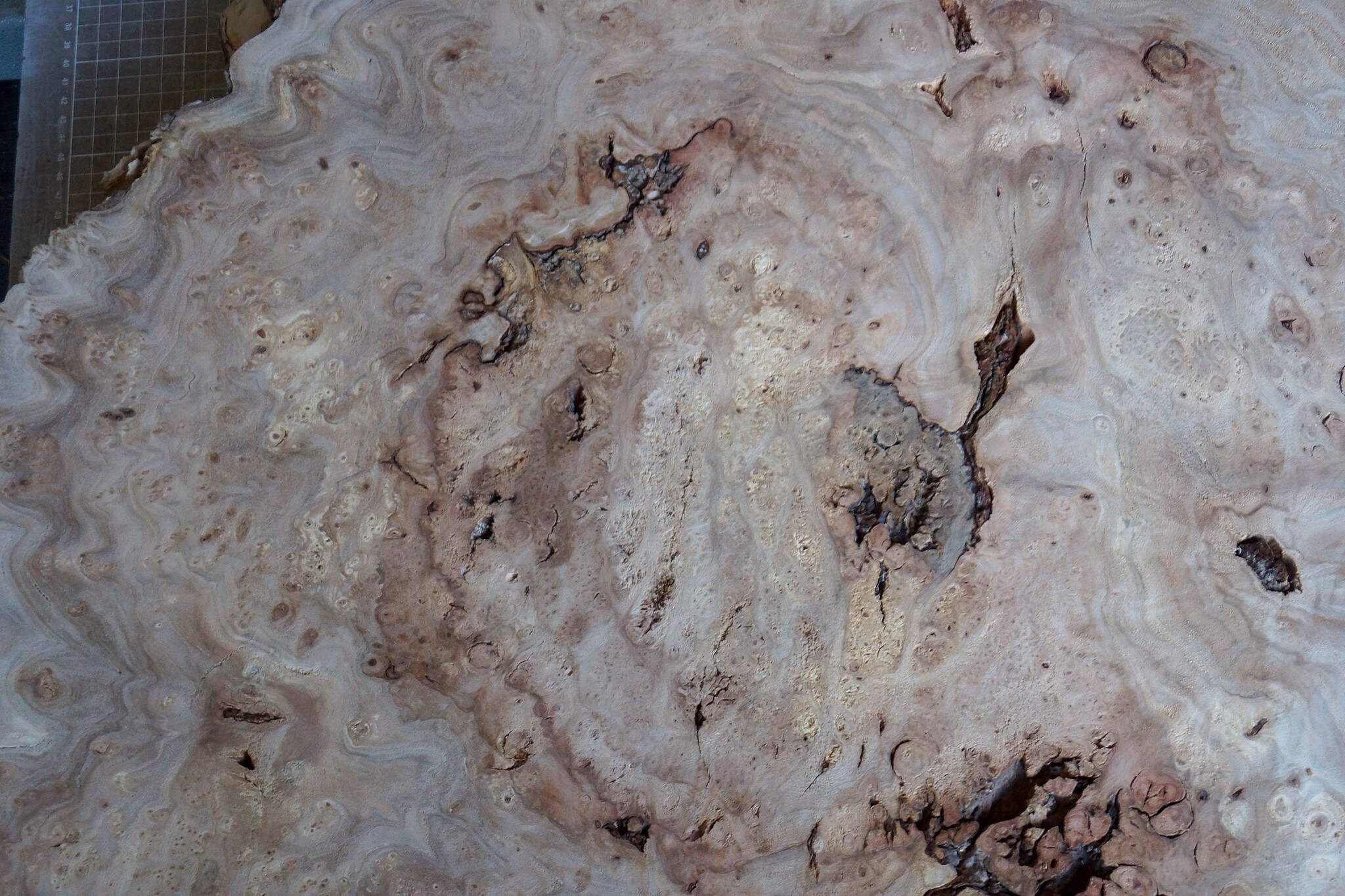 Caucasian Elm burl, milled, approx. 970 x 940/510 x 62 mm, 41229, airdried, cracks, branches, rotten areas, ingrown bark. You will receive the product as shown.
