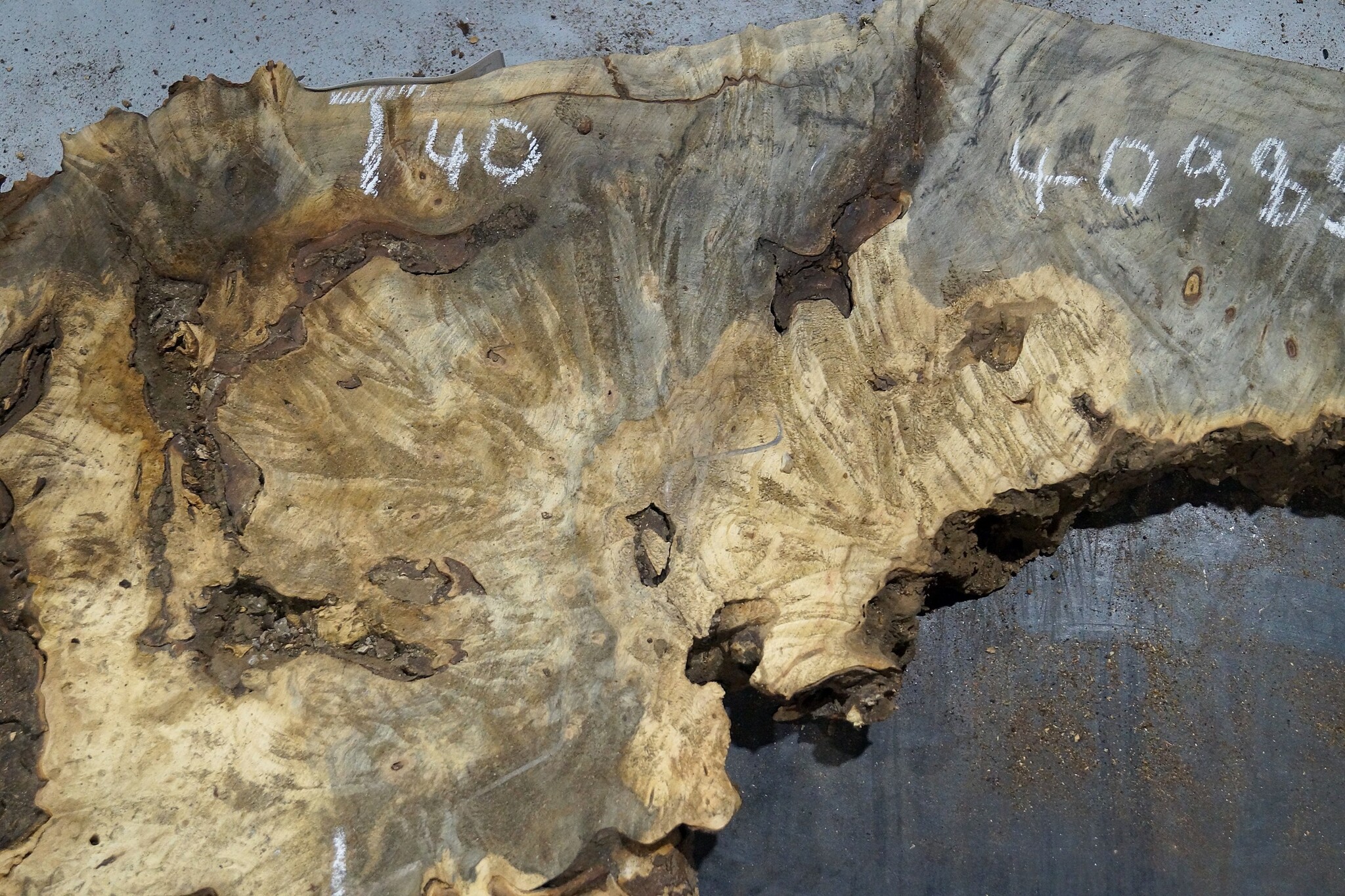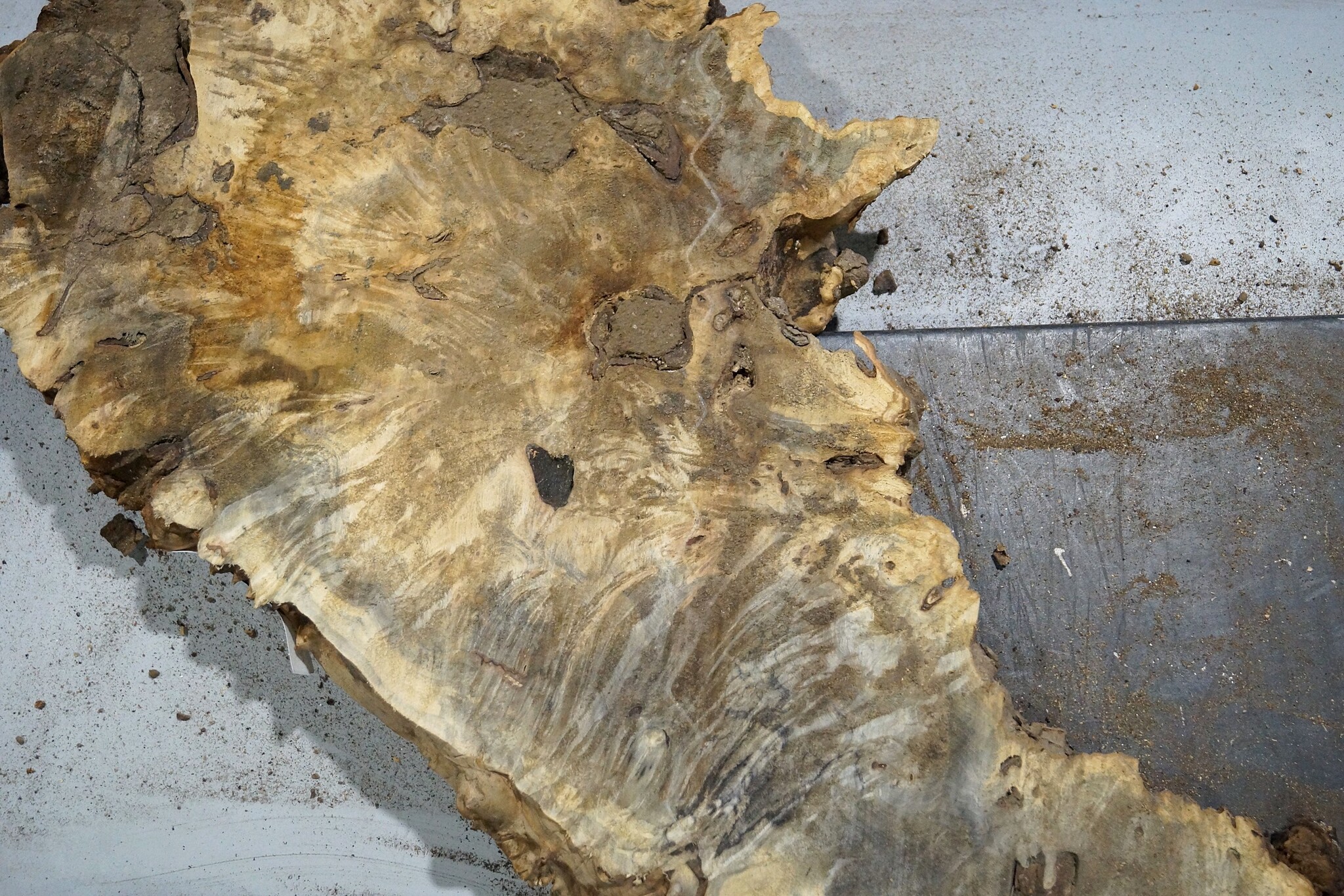 Buckeye burl slab, approx. 640/570 x 400/150 x 55 mm, 7,2 kg, 40985, clay and bark inclusions possible, kiln dried. You will receive the product as shown on the pictures!