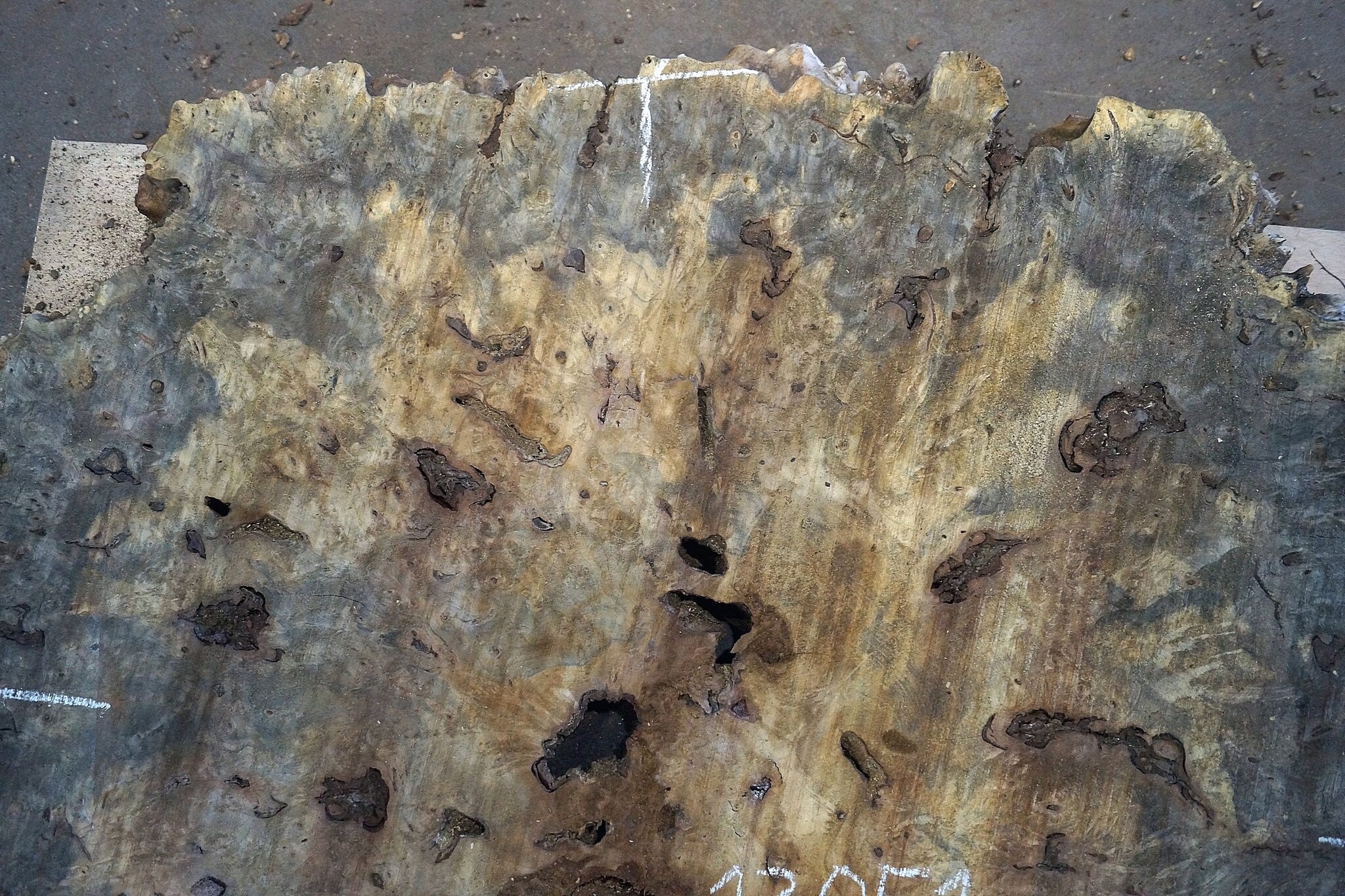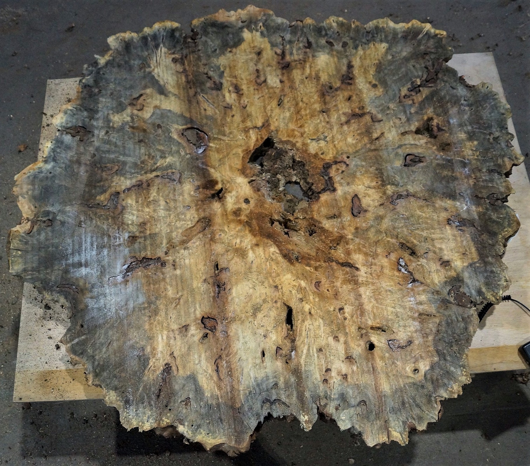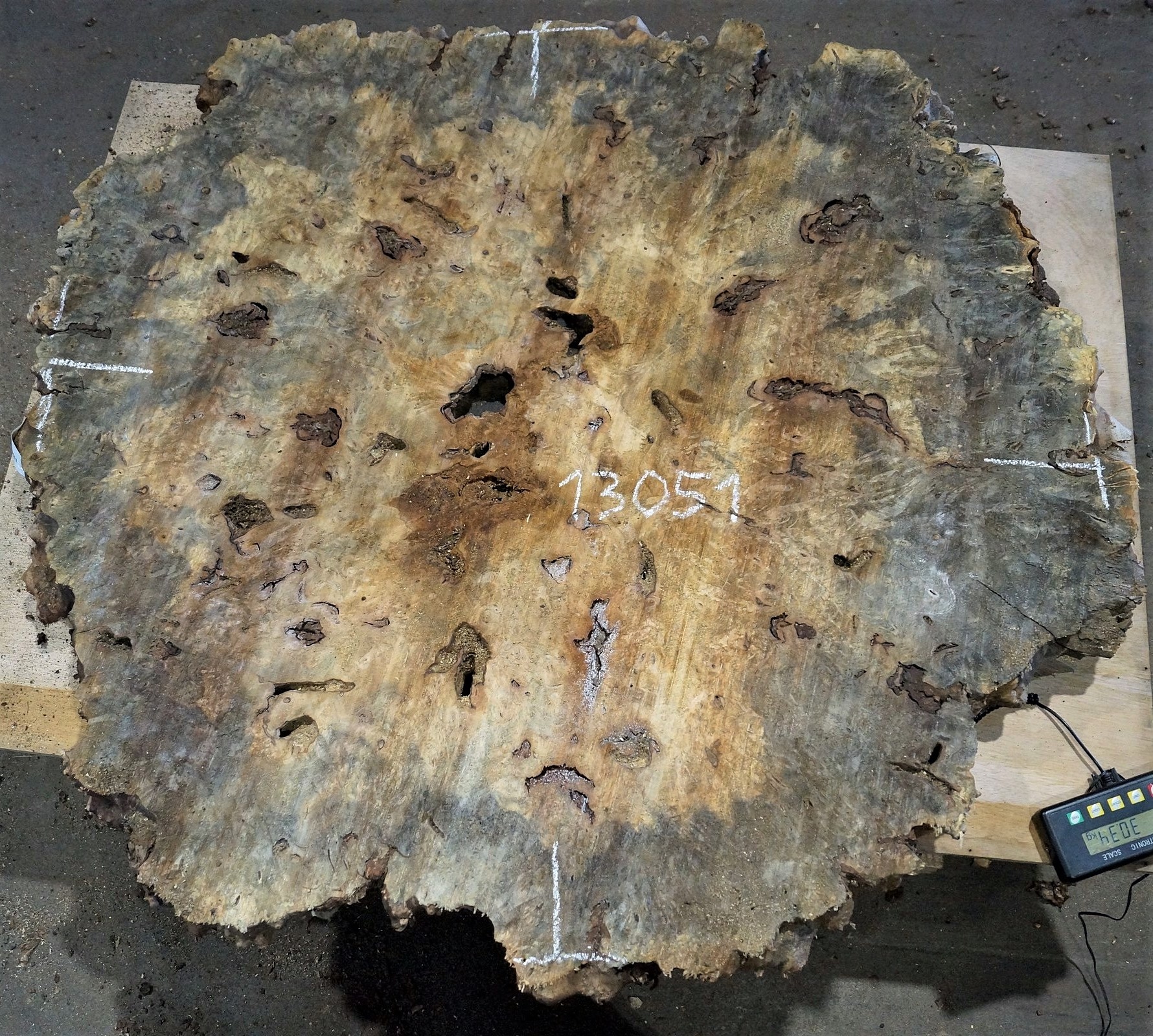 Buckeye Burl table top, approx. 1330(1420) x 1260(1330) x 52 mm, 13051, kiln dried, rot spot, ingrown bark and clay possible