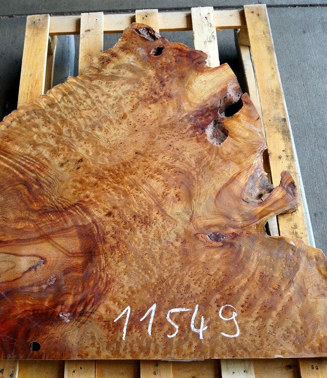 Camphor table top, approx. 950 x 750 x 55 mm, 31 kg, 11549, air dried, cut 06/2018. Partner table top is number 11551, it is not included if you order this piece. You will receive the product as shown.