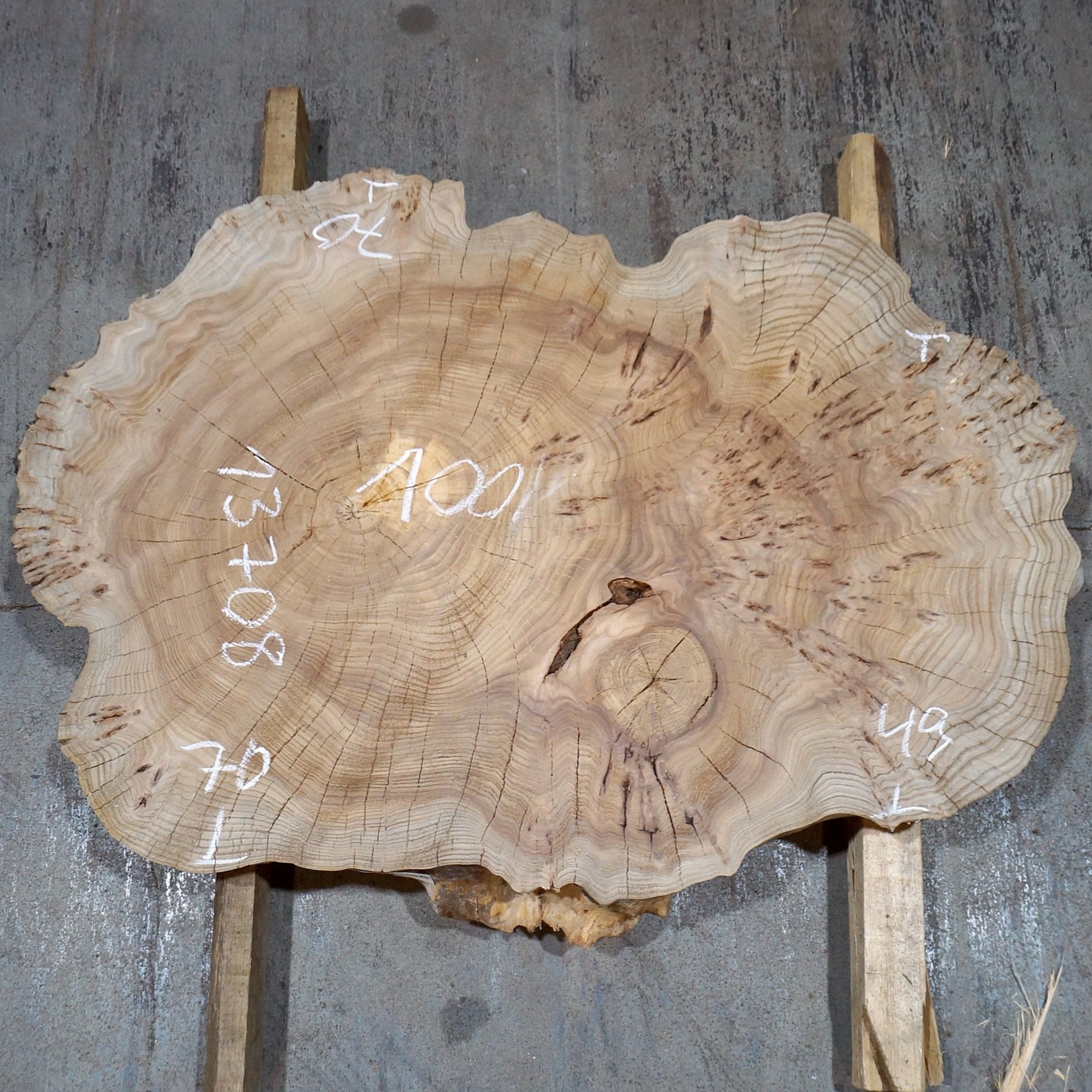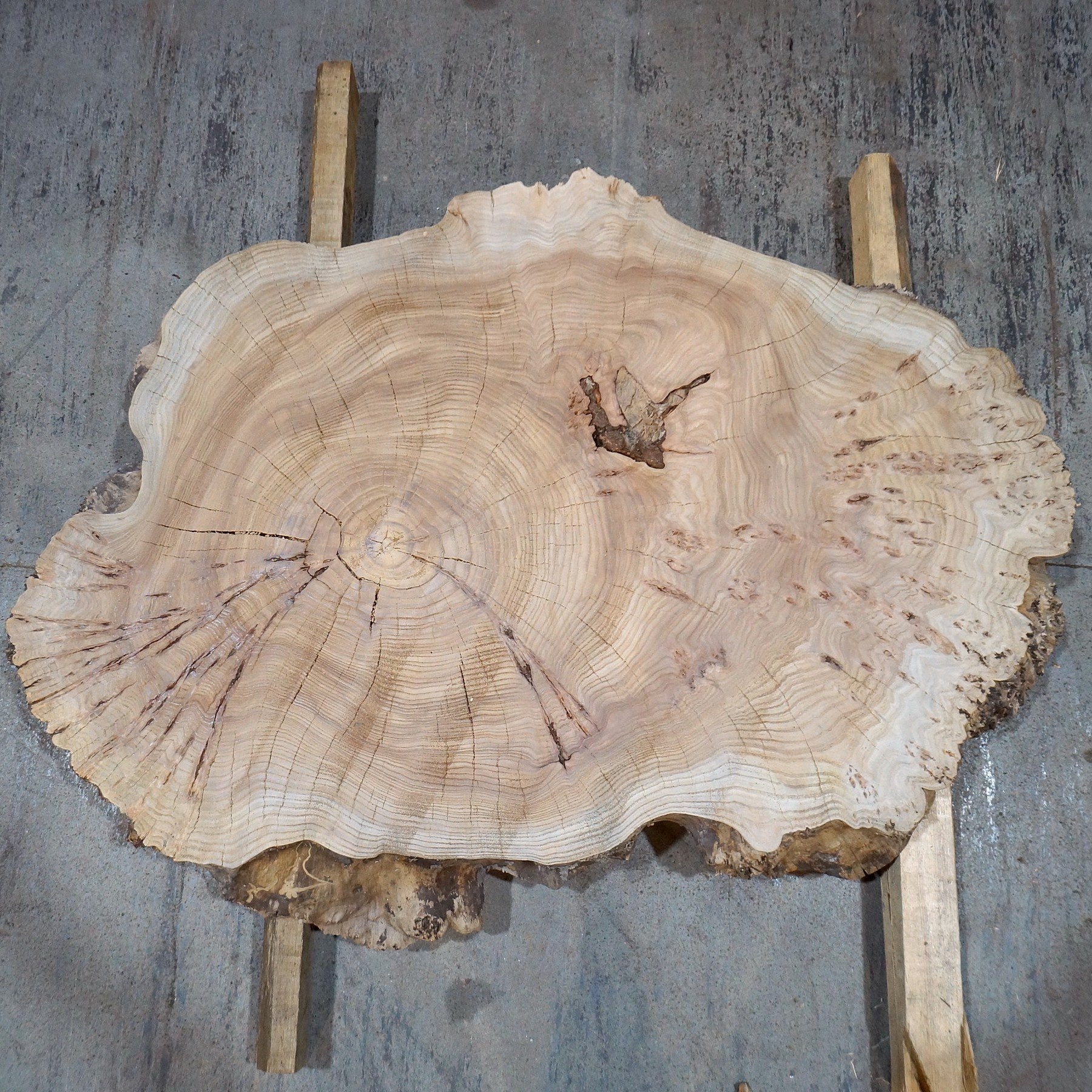 Caucasian Elm, burl slab, milled, approx. 1000 x 700 x 80 mm, 13708, air dried, cracks, ingrown bark, knots. You will receive the product as shown.