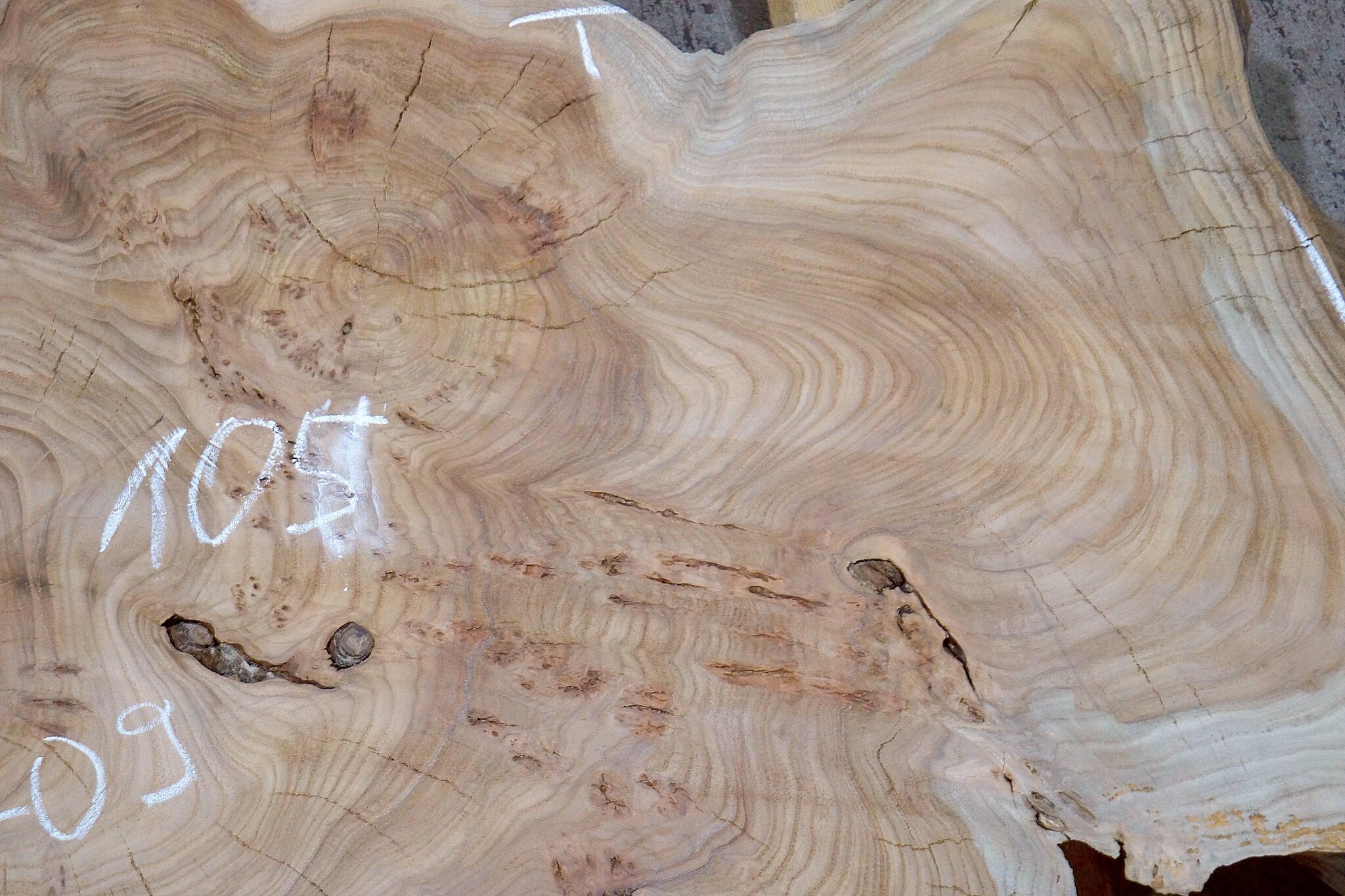 Caucasian Elm, burl slab, milled, approx. 1050 x 720 x 80 mm, 13709, air dried, cracks, ingrown bark, ingrown clay. You will receive the product as shown.