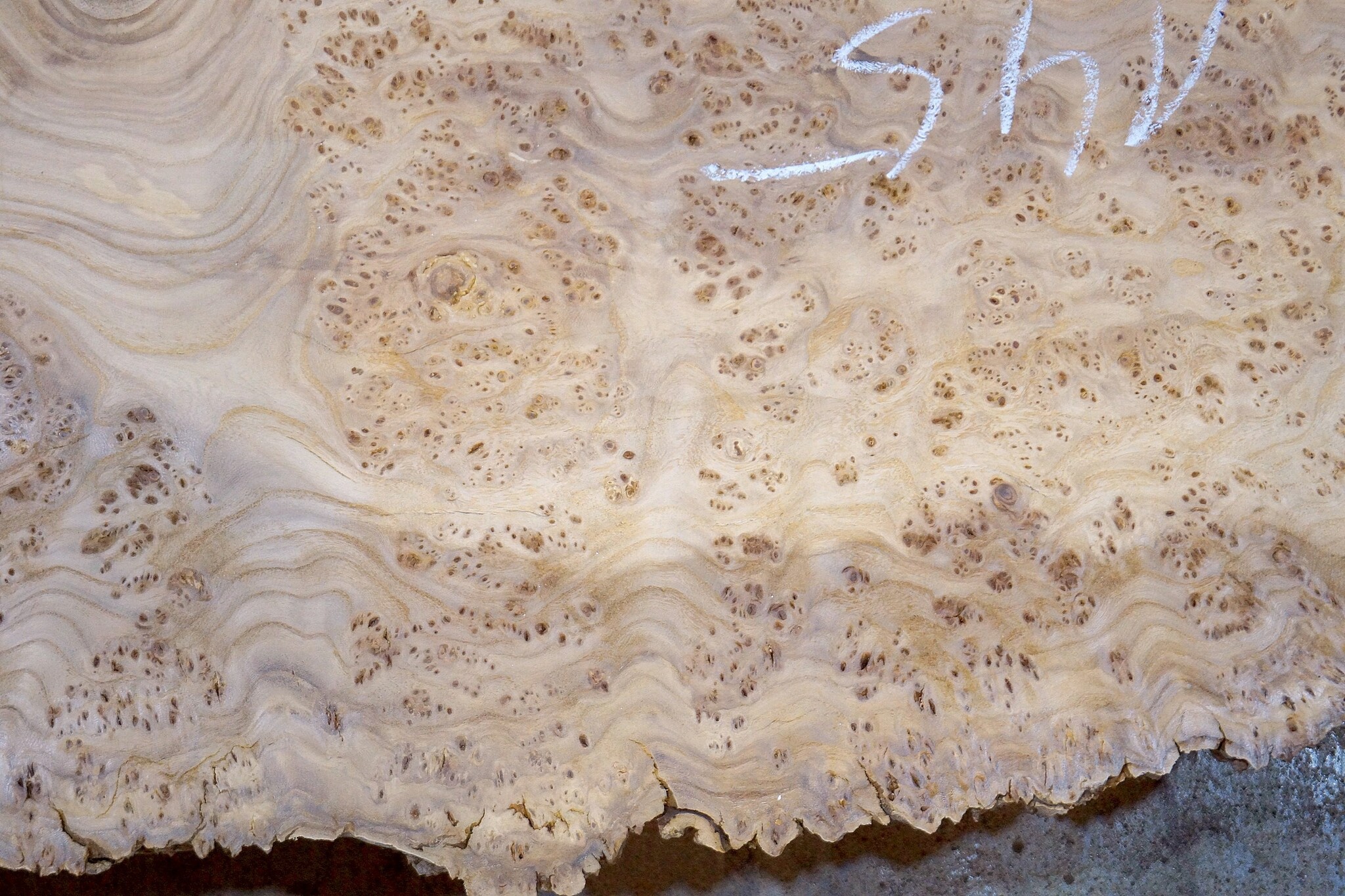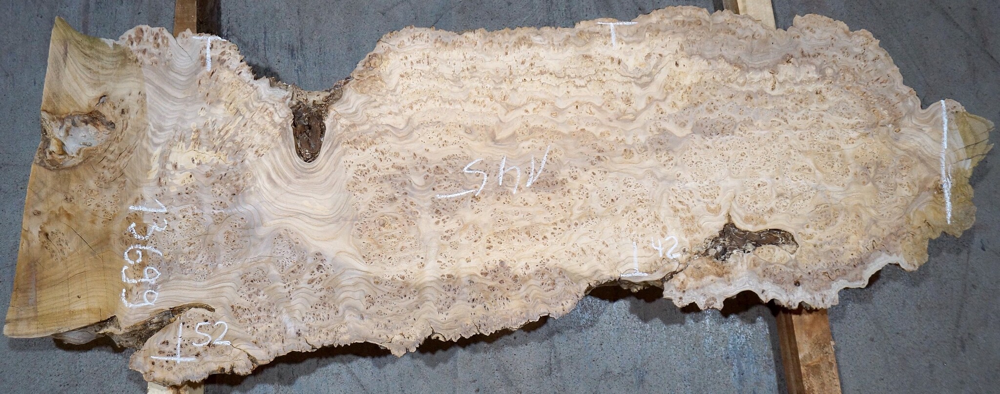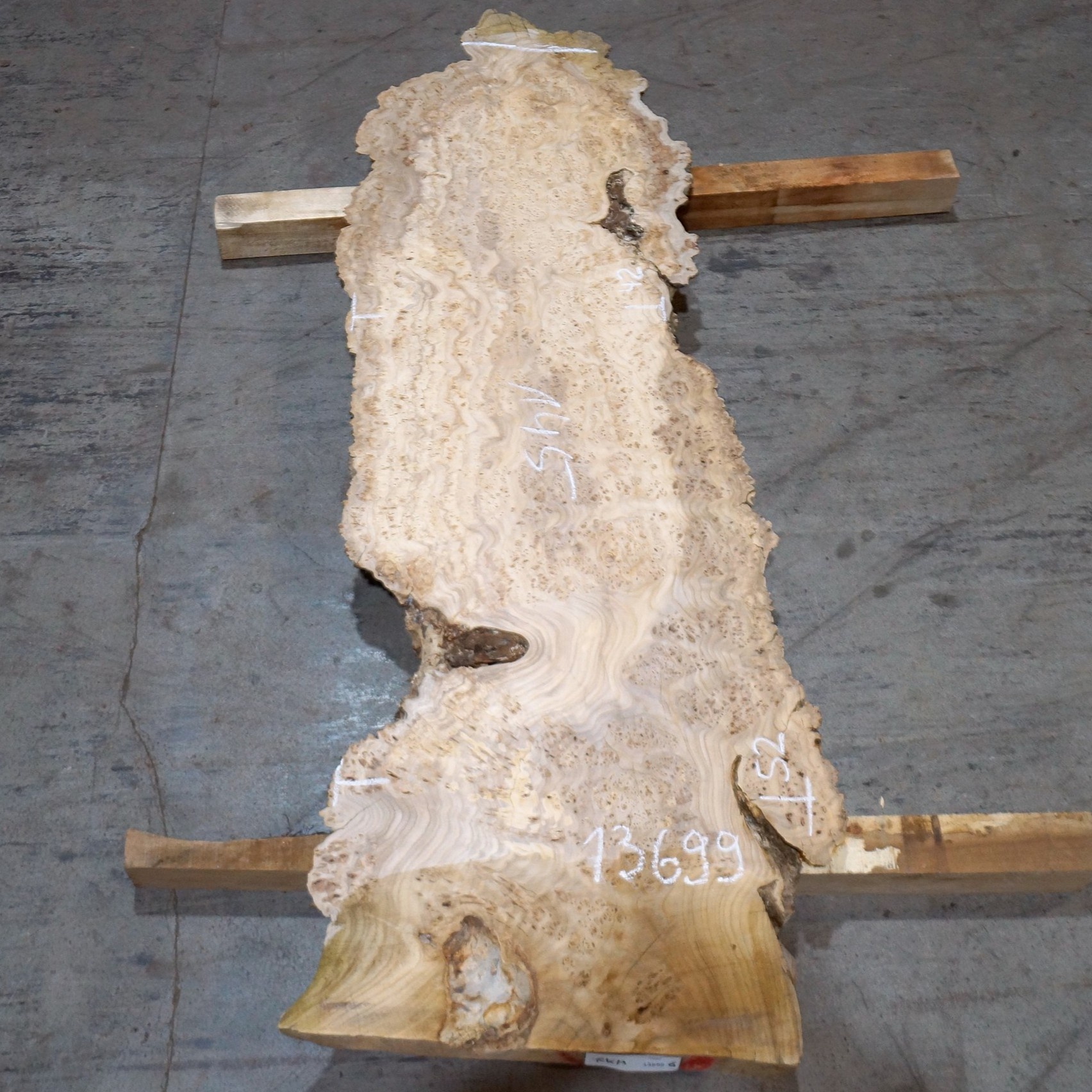 Caucasian Elm, burl slab, milled, approx. 1450 x 420 x 40 mm, 13699, air dried, cracks, ingrown bark. You will receive the product as shown.