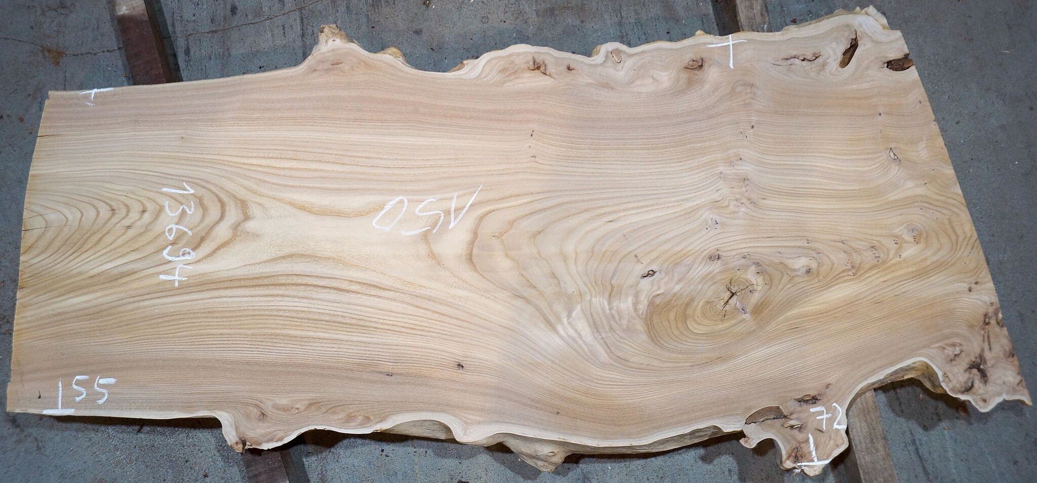 Caucasian Elm, burl slab, milled, approx. 1500 x 550/720 x 48 mm, 13694, air dried, cracks, ingrown bark. You will receive the product as shown.