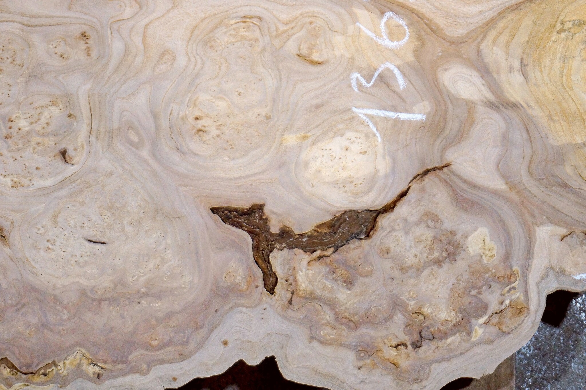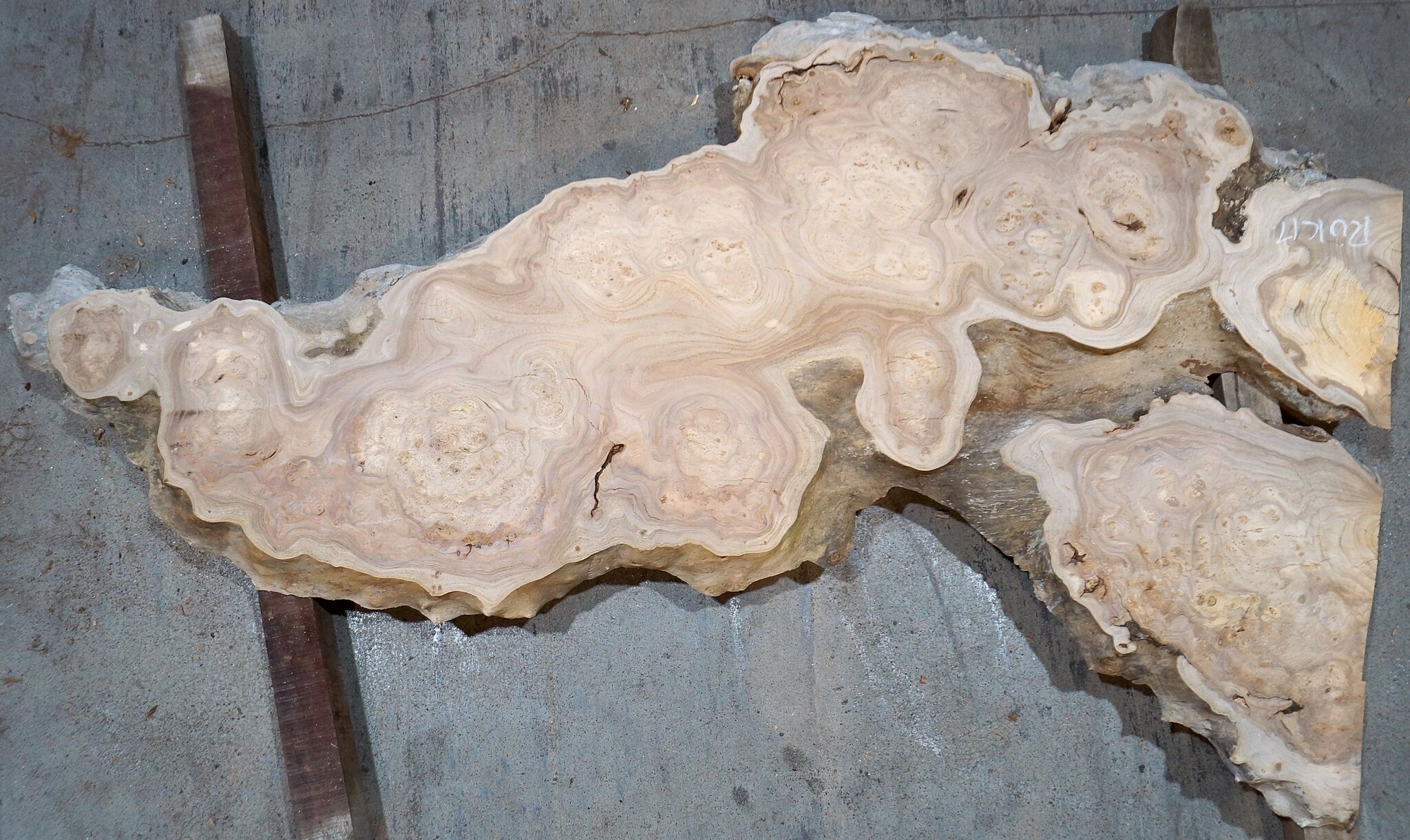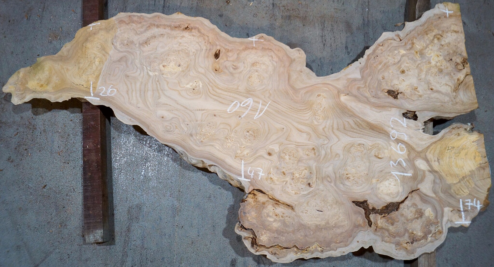 Caucasian Elm, burl slab, milled, approx. 1600 x 470 x 40 mm, 13692, air dried, cracks, rotten areas, ingrown bark. You will receive the product as shown.