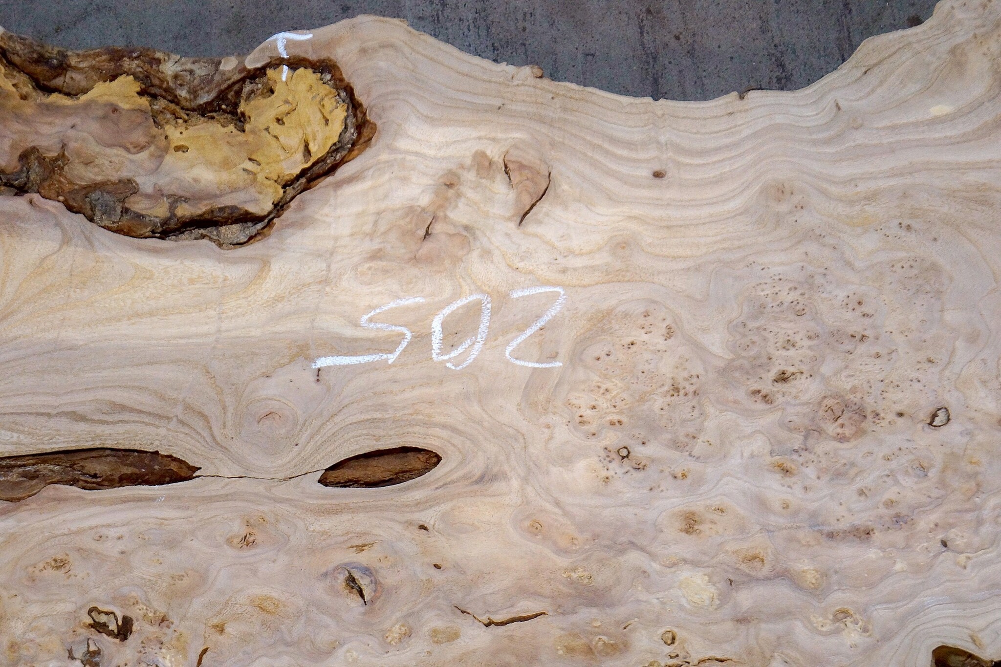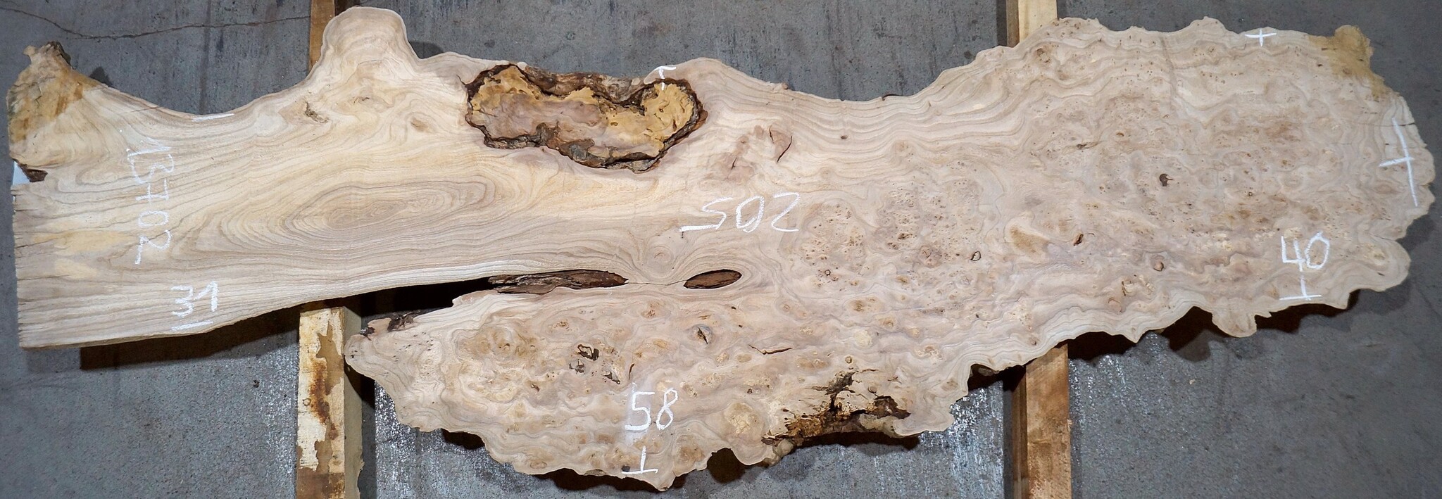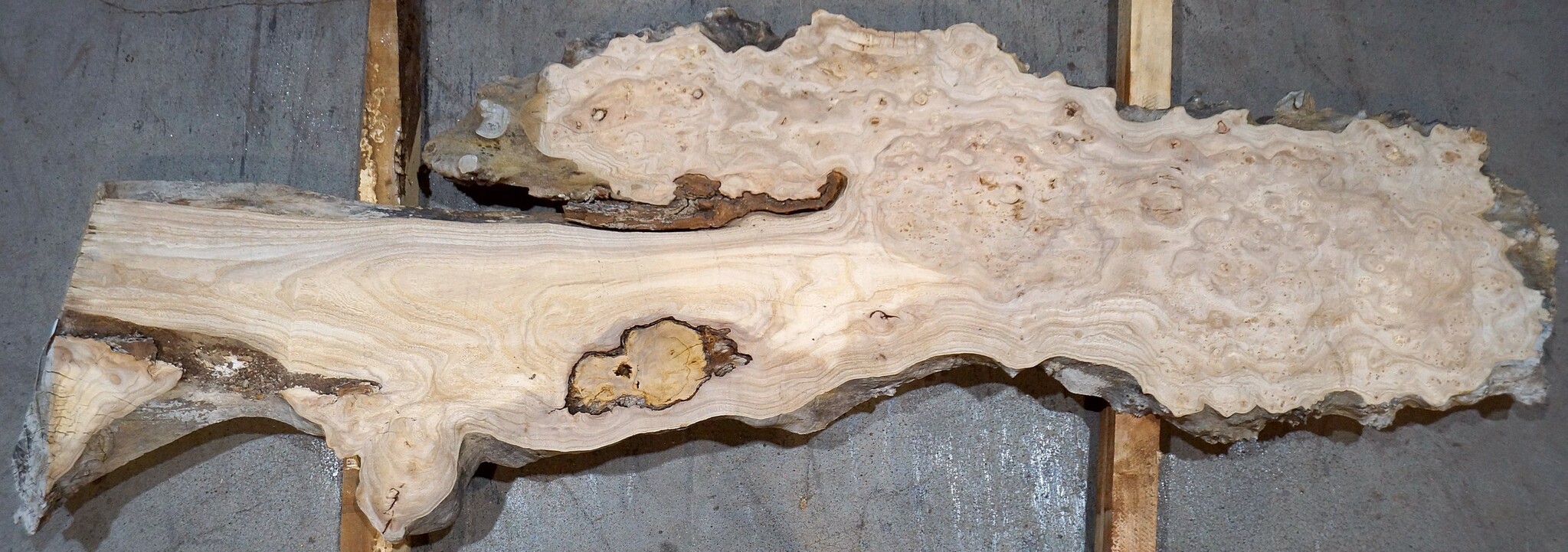 Caucasian Elm, burl slab, milled, approx. 2050 x 400 x 40 mm, 13702, air dried, cracks, ingrown bark. You will receive the product as shown.