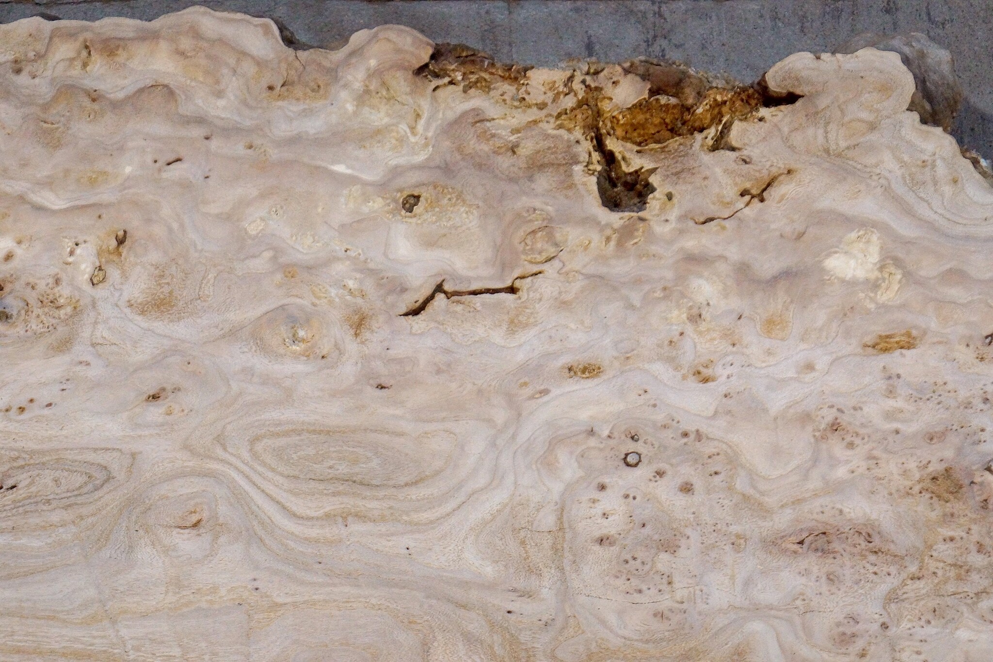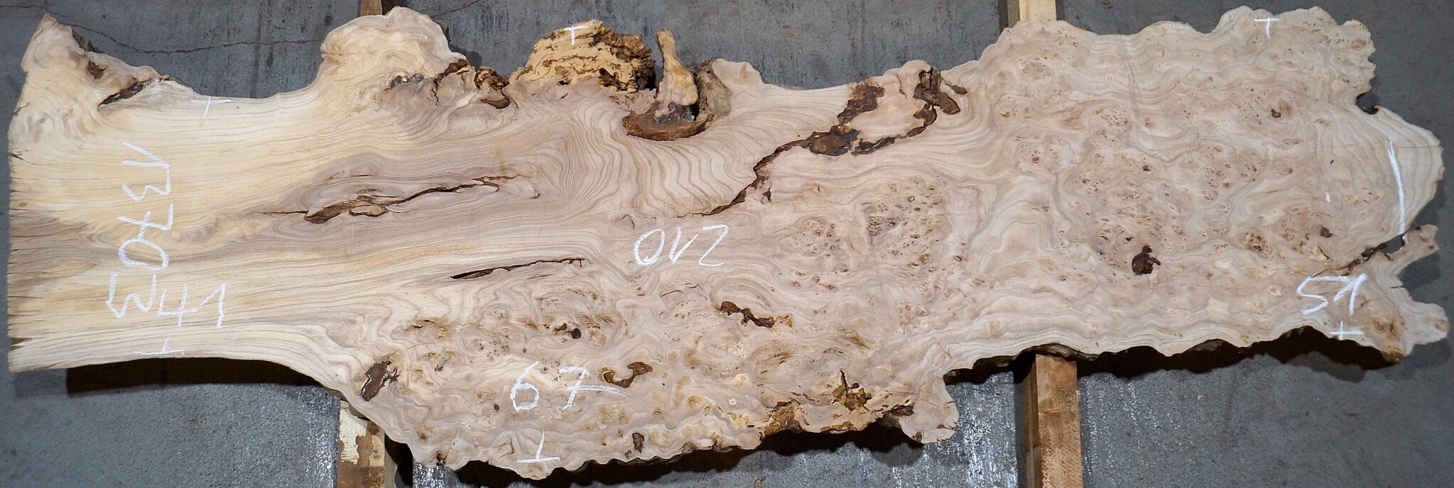 Caucasian Elm, burl slab, milled, approx. 2100 x 510 x 40 mm, 13703, air dried, cracks, ingrown bark, insect holes. You will receive the product as shown.