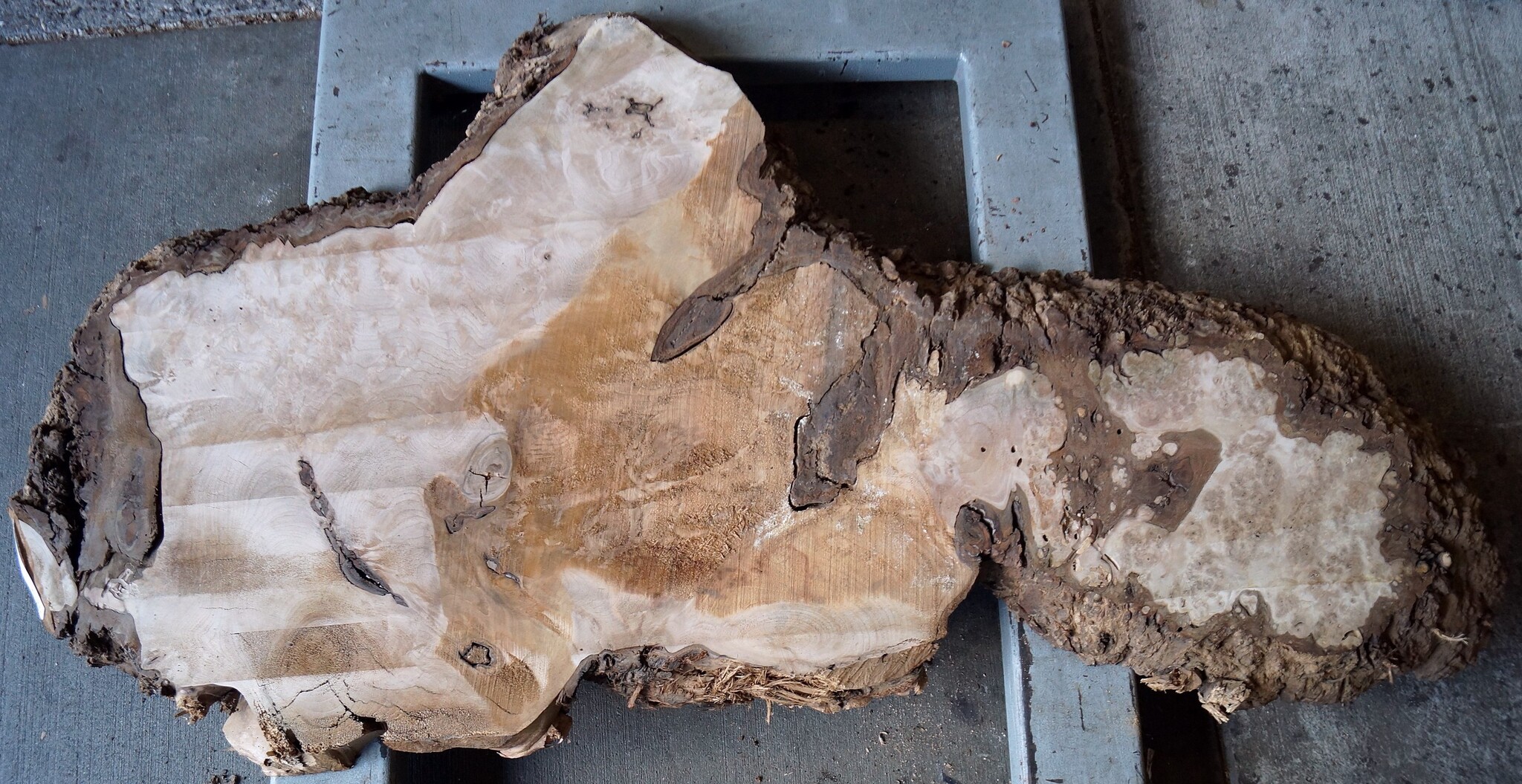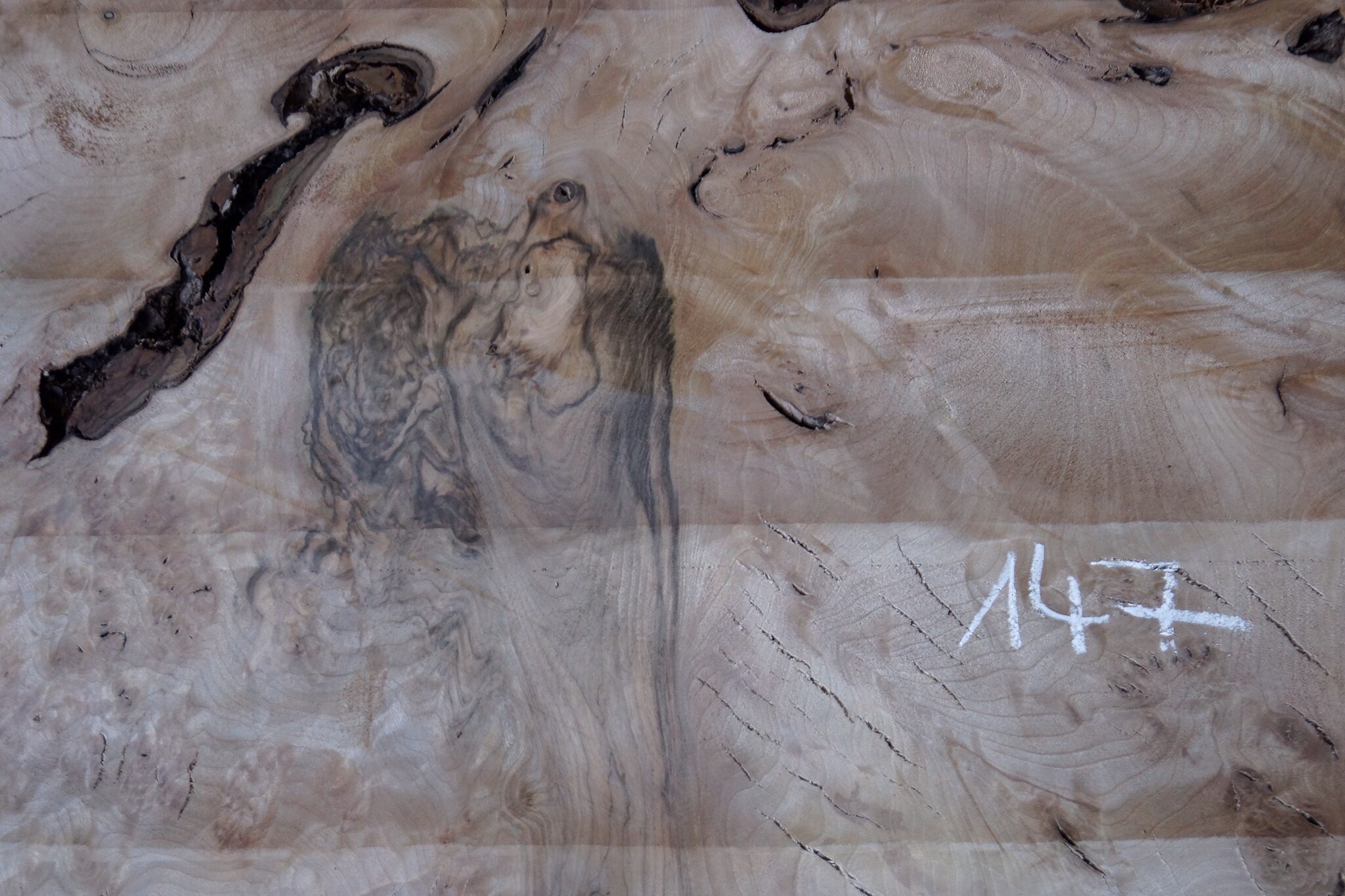 Caucasian Walnut burl, milled, approx. 1470 x 440 x 60 mm, 13657, approx.23 kg, air dried, ingrown bark, cracks, knots, insect holes. You will receive the product as shown.