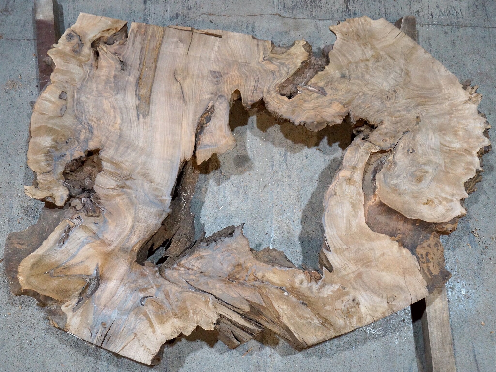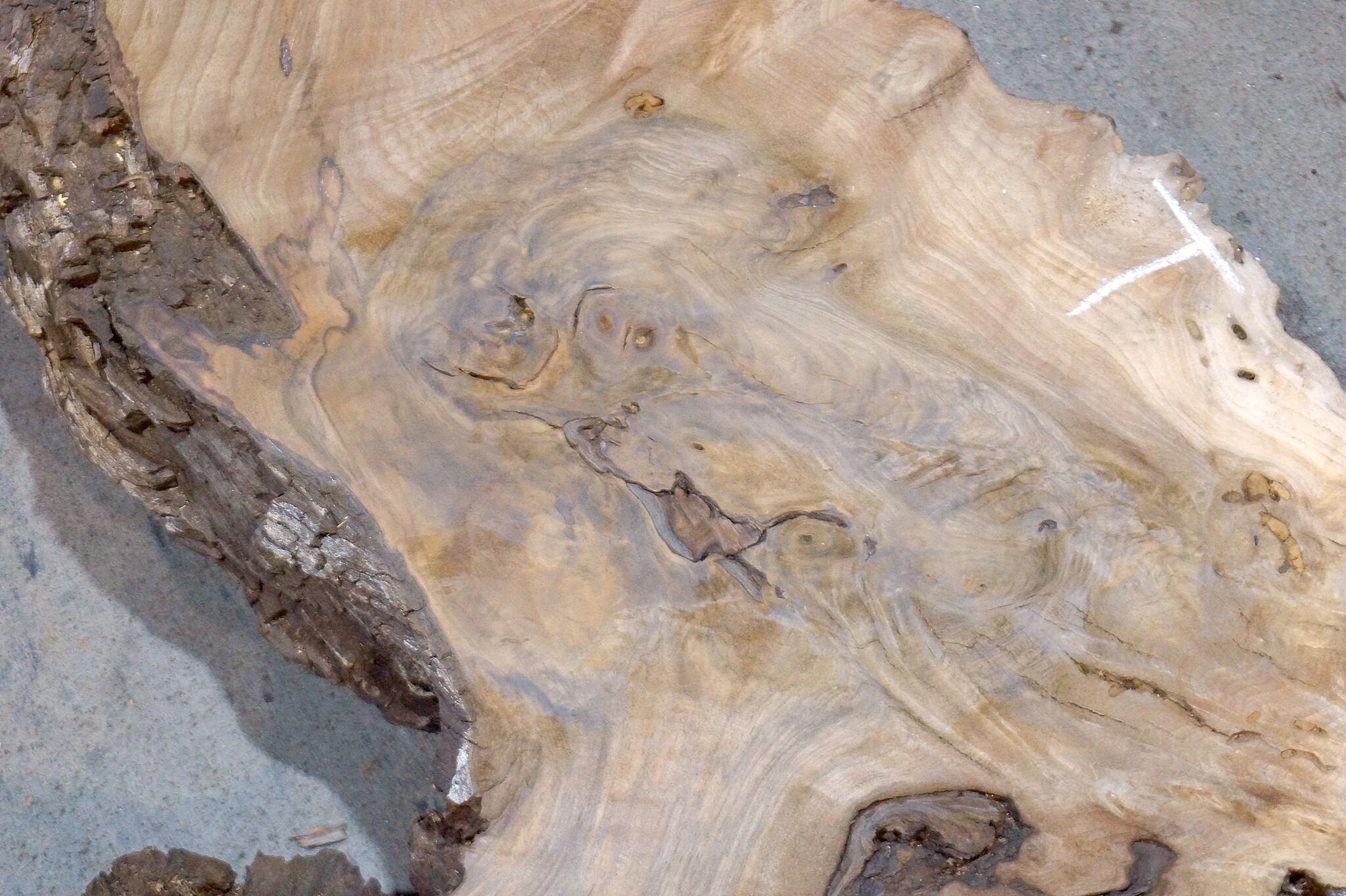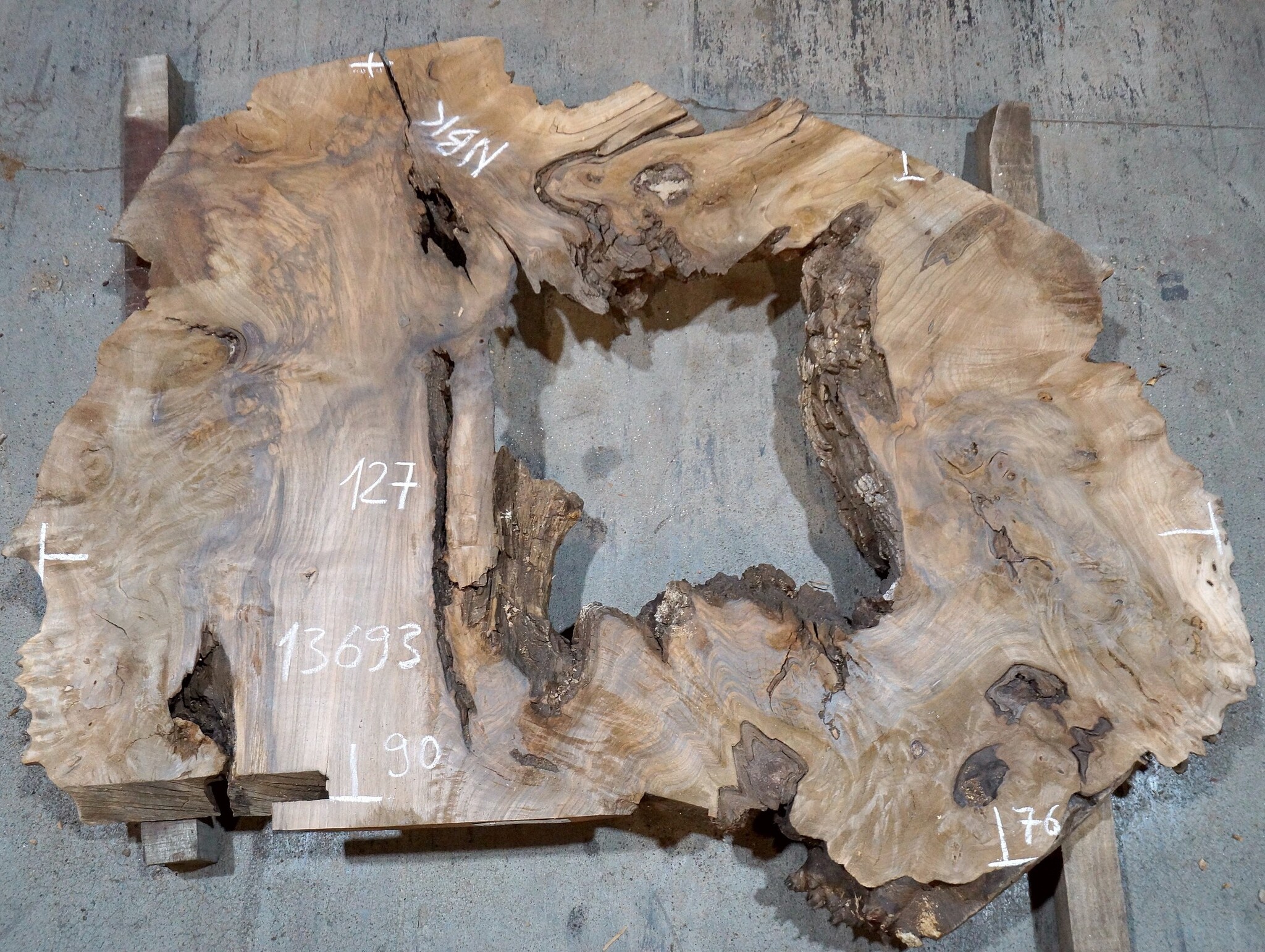 Caucasian walnut, slab, milled, approx.. 1270 x 900/760 x 70 mm, 13693, air dried, cracks, insect holes, ingrown bark. You will receive the product as shown.